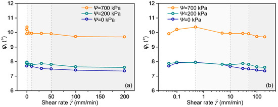 As shown in Figure 9 and Figure 10, the rate effects on the two residual strength parameters ( and ) exhibited distinct suction dependency and stage characteristics with varying . On the normal scale (Figure 9a) and logarithmic scale (Figure 9b), demonstrated different trends under varying suction conditions. Under saturated conditions ( = 0 kPa), generally decreased with increasing , declining from 7.95° at 0.5 mm/min to 7.35° at 200 mm/min (a 0.6° reduction). Notably, this stage exhibited a critical transition of of 1.4 mm/min, where the rate-strengthening behavior began to weaken, consistently with findings from slow-moving landslide studies [8]. In contrast, under unsaturated conditions, initially increased within the low-speed range (0.05–0.5 mm/min) before gradually decreasing with further rate increases. The magnitude of reduction differed between suction levels: 0.36° at 200 kPa suction and 0.68° at 700 kPa suction.
