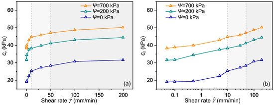 As shown in Figure 10, residual cohesion under all three matric suction conditions exhibited positive rate effects with distinct stage characteristics. In the low-speed shear stage ( ≤ 10 mm/min), residual cohesion increased rapidly: that of the high-suction group ( = 700 kPa) increased from 38.24 kPa to 44.73 kPa, that of the medium-suction group ( = 200 kPa) from 31.54 kPa to 38.25 kPa, and that of the low-suction group ( = 0 kPa) from 19.07 kPa to 25.32 kPa. This rapid increase occurred since low values provide sufficient time for pore water drainage, gradually enhancing effective stress. The increased effective stress collaborates with clay particles in the cohesive soil to achieve local rearrangement through particle sliding, rotation, and aggregate breakdown [48,49], forming a denser residual structure.