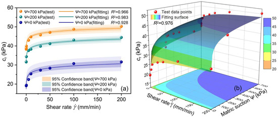 Figure 11b illustrates the fitted 3D surface (R2 = 0.976), demonstrating excellent agreement with experimental data and validating the model’s ability to capture multi-field coupling mechanisms in residual strength. As illustrated, the surface monotonically increases along the -axis (0–700 kPa), reflecting enhanced soil skeleton stiffness under higher suction, which strengthens . Along the -axis (0.05–200 mm/min), exhibits nonlinear growth. At low rates ( ≤ 10 mm/min), pronounced positive rate effects dominate, while at high rates ( > 50 mm/min), the growth rate stabilizes, consistently with experimental trends. Notably, the surface slope significantly decreases for > 200 kPa (Figure 11b’s blue region), indicating densified soil structure under dry conditions where ’s modulation of weakens. Conversely, the steepest curvature occurs at < 200 kPa and ≤ 10 mm/min, corresponding to the rapid response in the low-speed shear phase (Section 4.2.2). Here, minor parameter perturbations trigger significant strength changes due to plastic flow dominance.