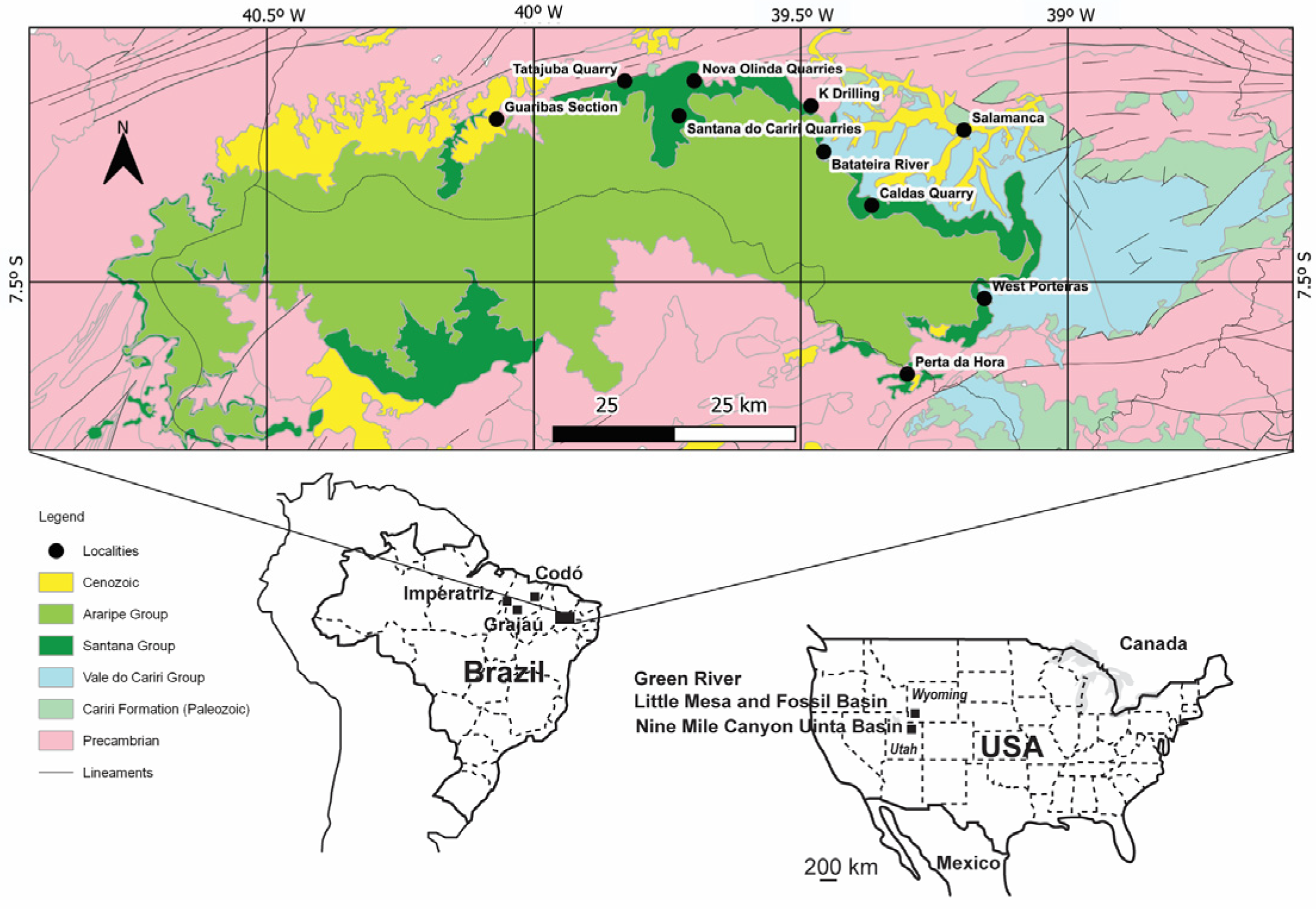 | Codó, Grajaú and Imperatriz | Codó, Grajaú and Imperatriz (Maranhão) | Codó Fm. (Lower Cretaceous) | 4° 33.6′ S 5° 44.7′ S 5° 31.6′ S | 43° 57.7′ W 46° 6.6′ W 47° 29.4′ W | [43] |
