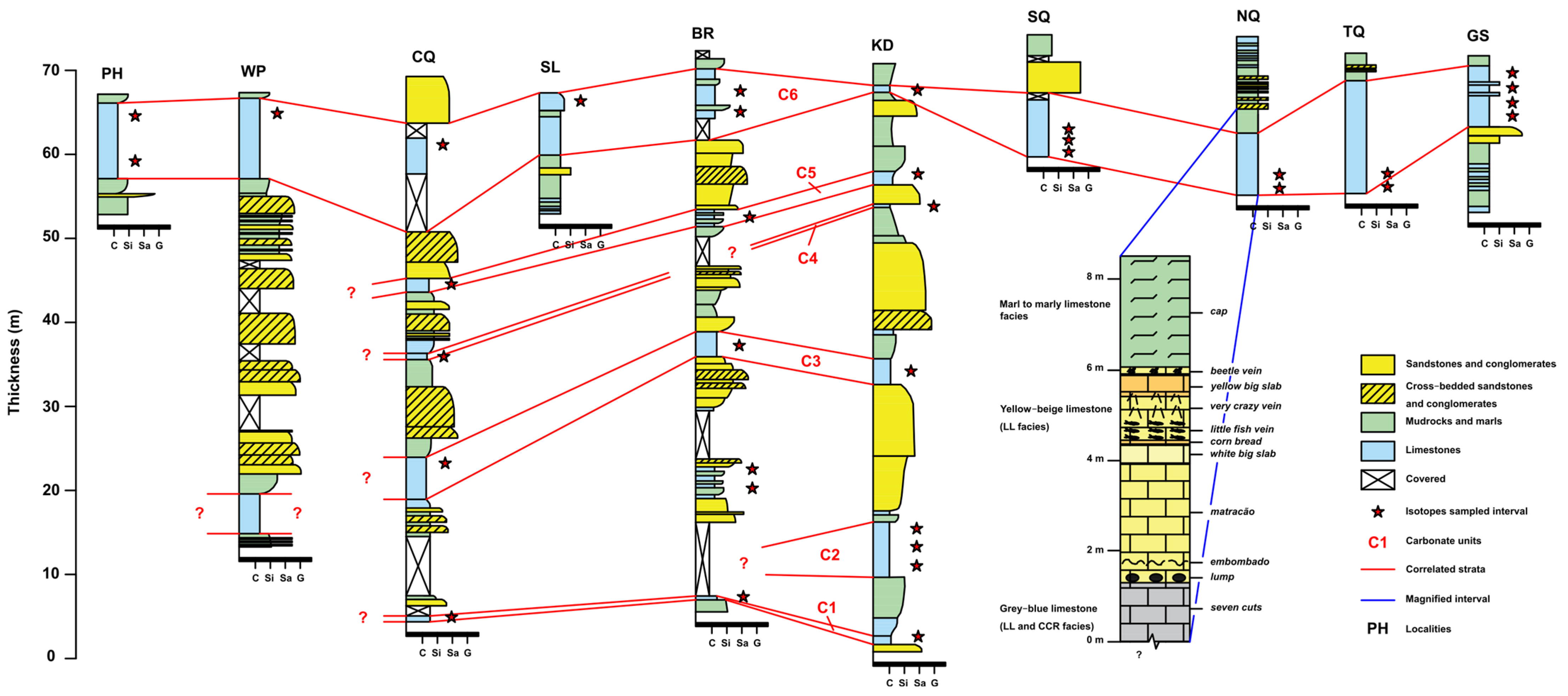 - Silveira, A.C. Geochemical, sedimentological, and stratigraphic characterization of the carbonate layer of level C6 of the Crato Formation (Pre-Salt, Aptian) of the Araripe Basin, NE Brazil. Ph.D. Thesis, Universidade Federal de Pernambuco, Fortaleza, Brazil, 2019. [Google Scholar]