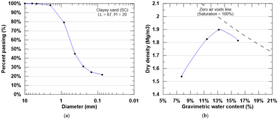 We constructed the model slopes using soil obtained from the Auburn, Alabama, USA area. The soil in this region is primarily residual and part of the Piedmont province [40] with primarily kaolinitic clays [41]. The soil was classified as a clayey sand (SC) using the Unified Soil Classification System (USCS) with a liquid limit of 67, a plasticity index of 20, and a fines content of 21.5% based on wet sieving [42]. The grain size distribution curve for the soil is shown in Figure 1a. Compaction characteristics were determined using the Standard Proctor test [43], which showed an optimum moisture content (OMC) of 13% and a maximum dry density (ρd,max) of 1.90 Mg/m3 (Figure 1b).