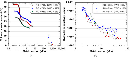 We also measured the soil–water characteristic curve (SWCC) of the fill material using the HYPROP and WP4 devices from the Meter Environment Company (Figure 2). We tested samples compacted to 79% (ρd = 1.51 Mg/m3) and 93% (ρd = 1.76 Mg/m3) relative compaction (RC) and an initial gravimetric water content (GWC) of either 9% (4% dry of optimum) or 12% (1% dry of optimum). The relative compaction values were selected to capture a range of densities and expected strengths. We selected water contents dry of optimum as this condition is most susceptible to piping [34,35]. Future work is needed to examine the patterns over a wider range of water contents and densities. The SWCC of the tested soil at the lower RC exhibits a distinct bimodal pattern, which tends to correlate with a bimodal pore distribution [39]. Oualmakran et al. [44] also found that soils compacted dry of optimum tended to show a bimodal pore size distribution, while soils compacted wet of optimum showed a unimodal distribution. This is consistent with the reduction in the bimodal shape for the specimen compacted near optimum water content and the denser specimen. Pore size distributions were not directly measured for the soils tested in this study, but this should be considered for future work. The HYPROP also provides estimates of the unsaturated hydraulic conductivity of the soil, which is shown in Figure 2b. The looser specimens showed higher conductivities near saturation, while the specimen compacted near the optimum water content showed the highest conductivity at larger suction values.
