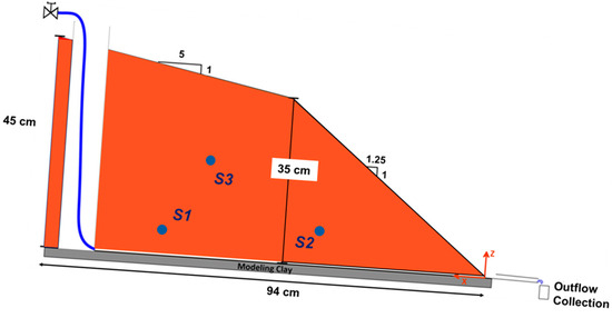 Our objective was to model the response of a natural soil pipe near an outlet, so we conducted a brief review of common features of soil pipes to design our experiment. Soil pipes typically form above bedrock or impermeable layers, developing parallel to these hydraulic barriers [21,45,46], and their outlets occur at depths of 15 to 80 cm, but can range from a few centimeters to 20 m [45,47]. Pipe diameters vary from 3 to 71 mm [48], with lengths between 2 and 61.8 cm, sometimes reaching more than 5 m [12,16]. Soil pipes are commonly found on slopes with a gradient of 0° to 30°, with 90% of collapsed pipes occurring in gradients of 4.6° to 13.5° [49]. Based on this information, we selected a steel container measuring 120 cm in length, 62 cm in width, and 62 cm in height for our experiments. The model slope had a maximum height of 45 cm and a base length of 94 cm (Figure 3). The container was placed on an inclined base to give a slight downward slope (4 degrees). A 1 cm thick layer of modeling clay was placed over a foundation of expanded polystyrene to simulate an impermeable base. Pre-formed soil pipes were introduced by placing either a 4 mm or 12 mm metal rod along the slope base before compaction. This diameter was selected as it is near the lower end of the range of diameters of soil pipes and would represent either a small pipe or a large macropore.