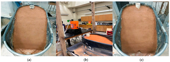 After placing the metal rod and PVC pipe, we prepared the soil at the required GWC (Table 1) and used a mixer attachment on an electric drill to thoroughly mix the soil. We placed the soil in 2.5 cm lifts and compacted the slope using flat-face hand tampers with 120 drops per lift to achieve the desired ρd throughout the slope height using the under-compaction method [50]. We weighed the soil required for each lift and used marks on the sides of the container to ensure the lifts were placed at the correct thickness. A temporary board was placed at the front of the container to keep the soil in place. To confirm the accuracy of the compaction method, samples were taken using rings at different lifts to verify the density and moisture content. Following compaction, we shaped the surface of the slope to achieve slopes of 1:5 (V:H) at the top and 1:2.5 (V:H) at the toe of the slope (Figure 3). We then carefully removed the rod by pulling it from the slope before starting the test.