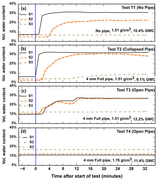 We selected tests T1-T4 to discuss the response of the soil matrix to water in the pipe during the initial stage of the test. Test T1 was the control slope (no initial void/pipe) and had an initial GWC of 10.4% and a ρd of 1.51 g/cm3. Tests T2 and T3 were conducted at initial water contents of 9.1% and 12.2%, respectively, with an initial void of 4 mm that extended from the inlet to the outlet (full pipe). Test T4 also had a full pipe, but with a ρd of 1.76 g/cm3 and an initial GWC of 11.4%. The effect of pipe responses on the evolution of VWC based on the different pipe responses is shown in Figure 5.