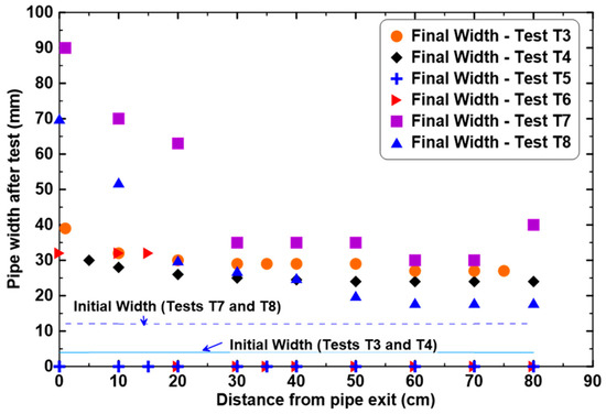Distribution of pipe diameter for tests T3-T8 along the length of the soil pipe at the end of the experiment. The pipe width was measured by dissection of the soil in the physical model.