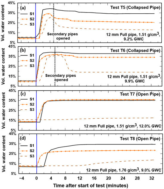 We performed four additional tests (T5–T8) to study the effects of using a larger initial pipe size of 12 mm (compared with 4 mm in the previous tests) on the model behavior (Table 3). Tests T5–T7 were performed at a ρd of 1.51 g/cm3 and target GWC of either 9 or 12%. Test T8 used the higher ρd (1.76 g/cm3) and a GWC of 8.5%. The evolution of VWC for these tests is shown in Figure 8.