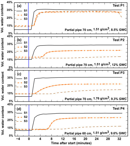 Test P2 had a similar ρd to test P1 but a higher initial water content (12%). Similarly to test P1, no visible erosion or soil movement was observed at the start. Sensor S1 responded first, but Sensors S2 and S3 exhibited a delayed response compared to test P1 (Figure 9a,b). Flow was observed at the exit of the pipe after 9 min, indicating that water was flowing from the soil matrix into the pipe. The pipe diameter at the exit remained constant throughout the test, unlike in test P1. The higher GWC at compaction reduced the likelihood of pipe collapse, as was observed in the full pipe tests (T3 and T7).