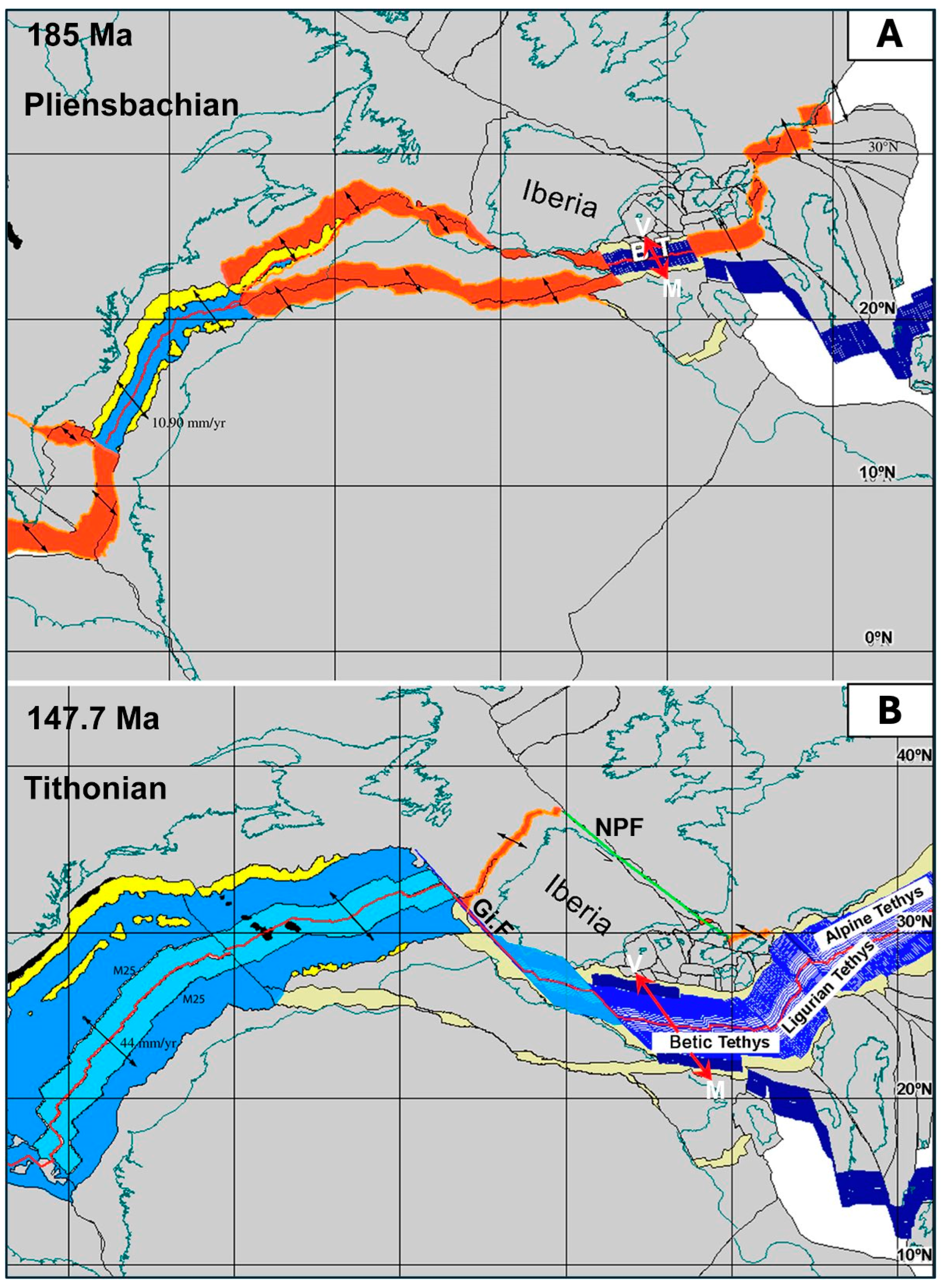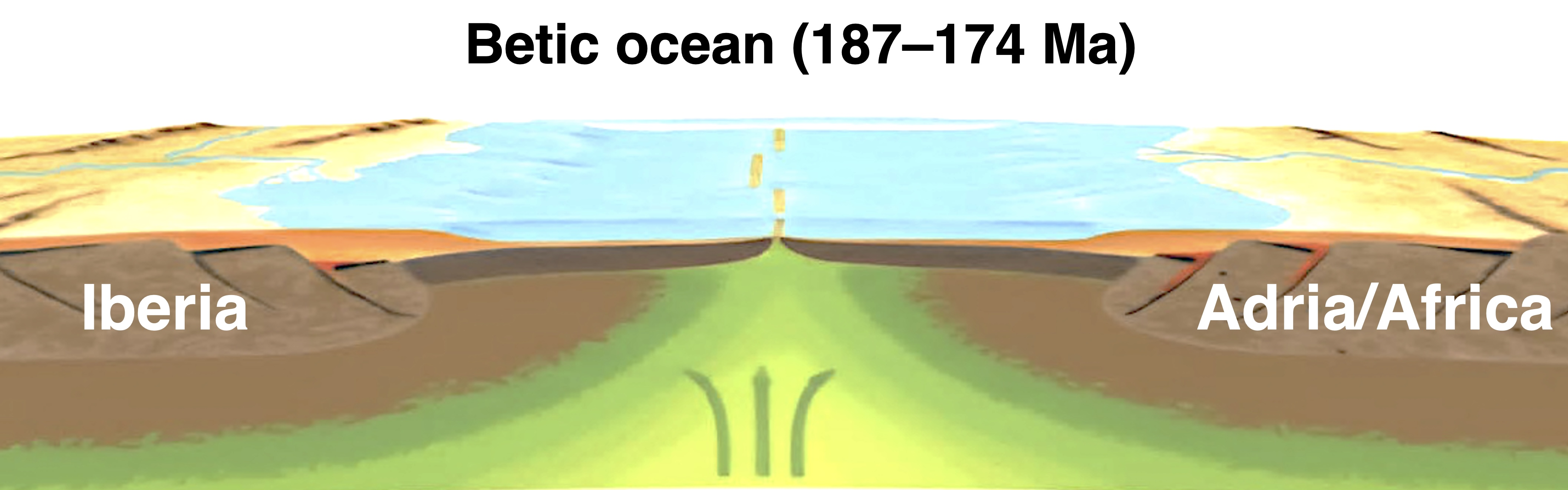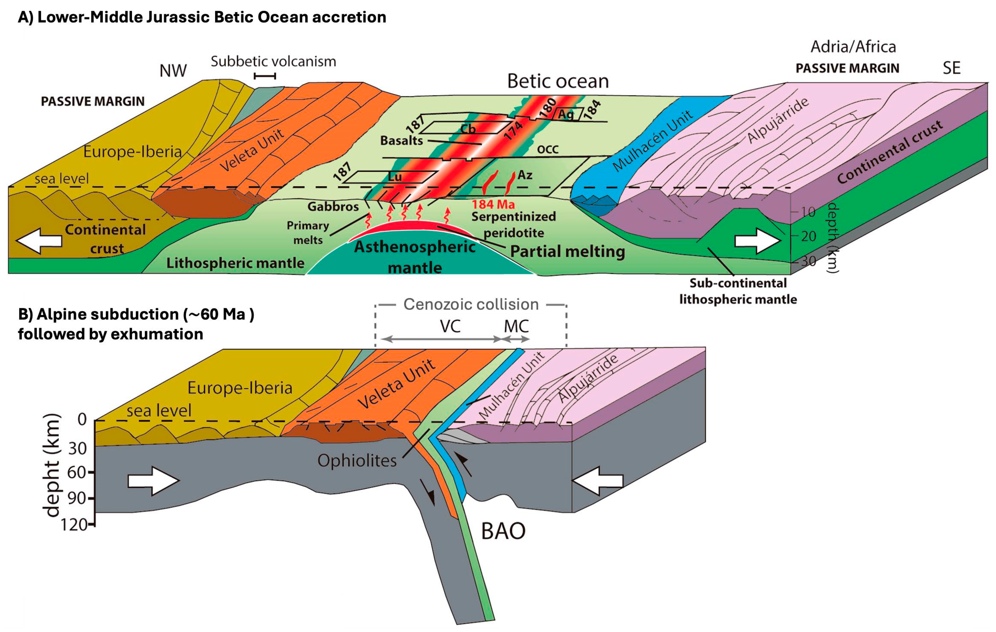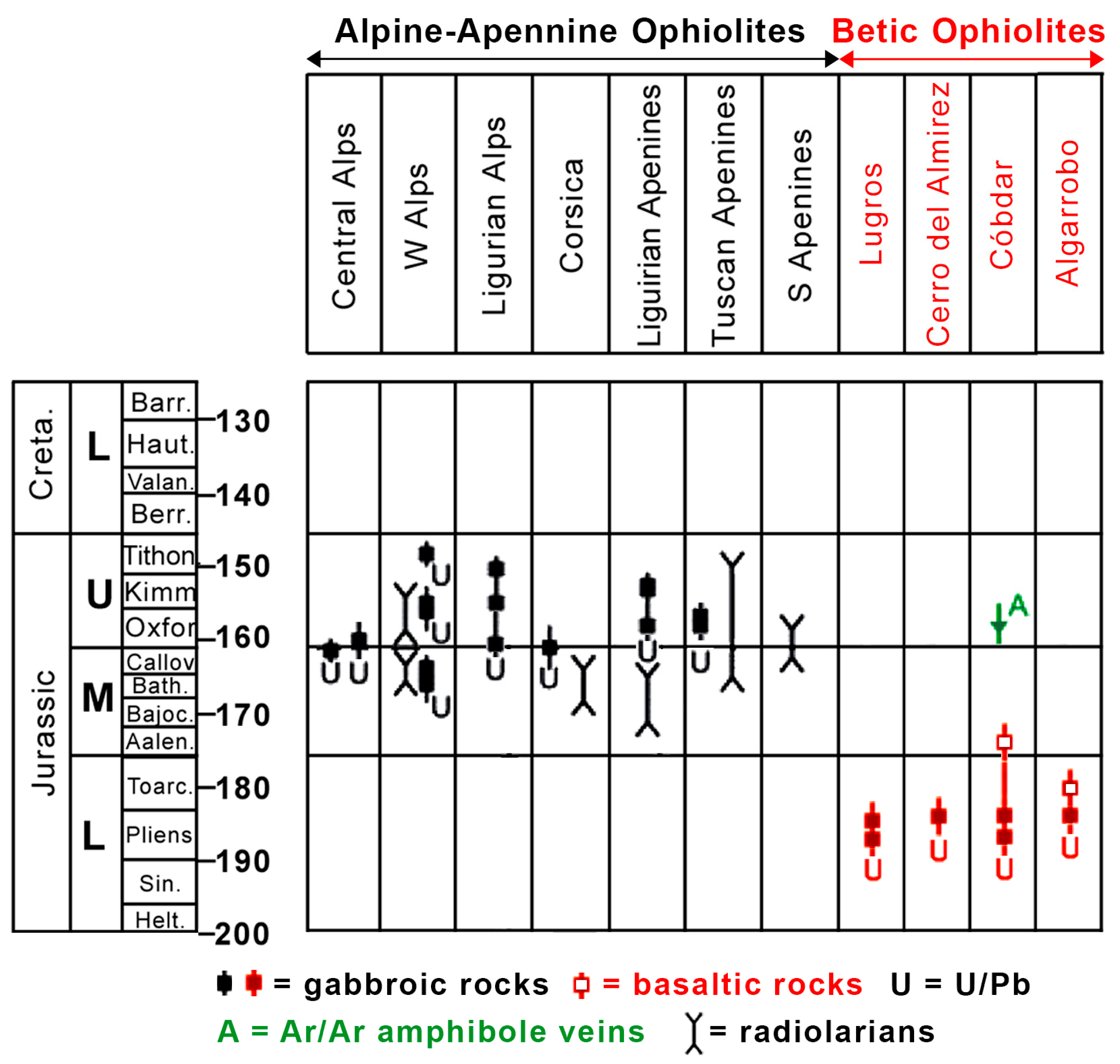 - The interpretative location of the four studied Betic ophiolitic outcrops (Lugros, Cóbdar, Algarrobo, and Almirez) within a hypothetical reconstruction of the Jurassic Betic Ocean is based primarily on their U-Pb ages. These ages range from 187 to 180 Ma for gabbros and basalts in the first three outcrops. The dolerite dikes that intruded into the Almirez ultramafic rocks under oceanic conditions yielded an age of 184 Ma. Therefore, these ultramafic rocks were already exhumed at that time into the ocean floor, forming an oceanic core complex.