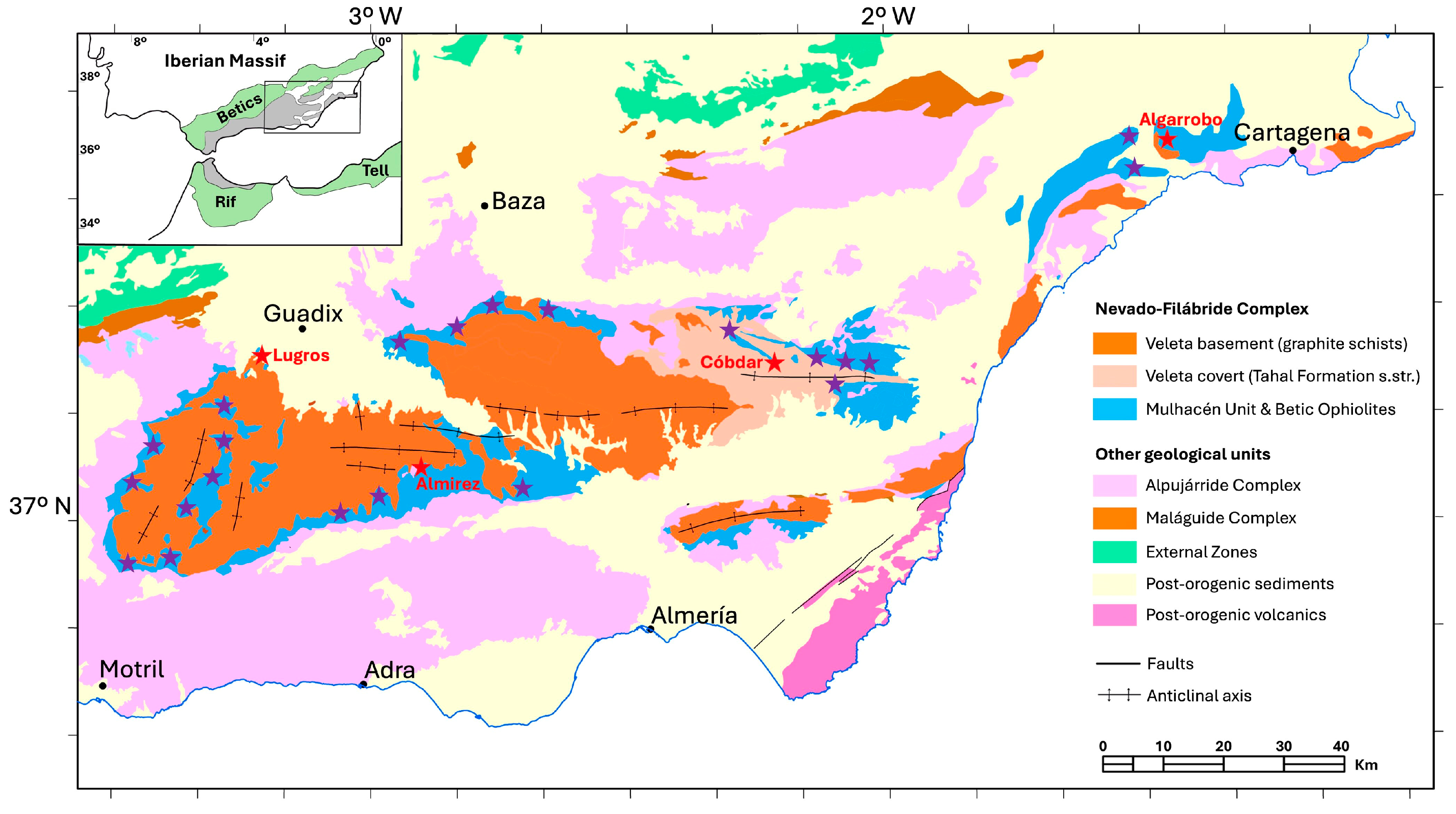 - Martín-Algarra, A.; García-Casco, A.; Gómez-Pugnaire, M.T.; Jabaloy-Sánchez, A.; Laborda-López, C.; Sánchez-Vizcaíno, V.L.; Mazzoli, S.; Navas-Parejo, P.; Perrone, V.; Rodríguez-Cañero, R.; et al. Paleozoic Basement and Pre-Alpine History of the Betic Cordillera. In The Geology of Iberia: A Geodynamic Approach; Quesada, C., Oliveira, J.T., Eds.; The Variscan Cycle: Barcelona, Spain, 2019; Volume 2, pp. 261–305. [Google Scholar]