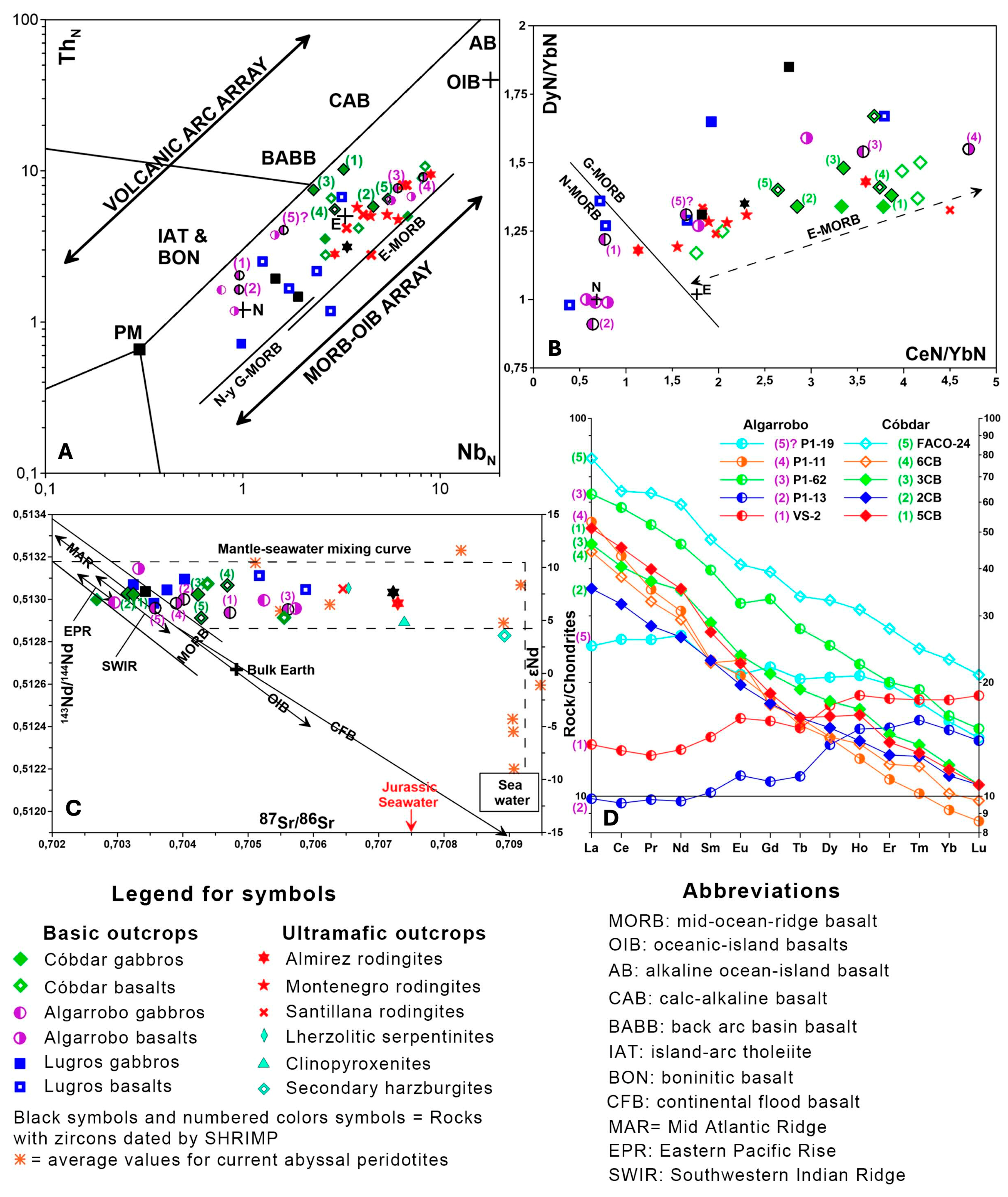 - Puga, E.; Fanning, M.; de Federico, A.D.; Nieto, J.M.; Beccaluva, L.; Bianchini, G.; Puga, M.A. Petrology, geochemistry and U-Pb geochronology of the Betic Ophiolites: Inferences for Pangaea break-up and birth of the westernmost Tethys Ocean. Lithos 2011, 124, 255–272. [Google Scholar] [CrossRef]