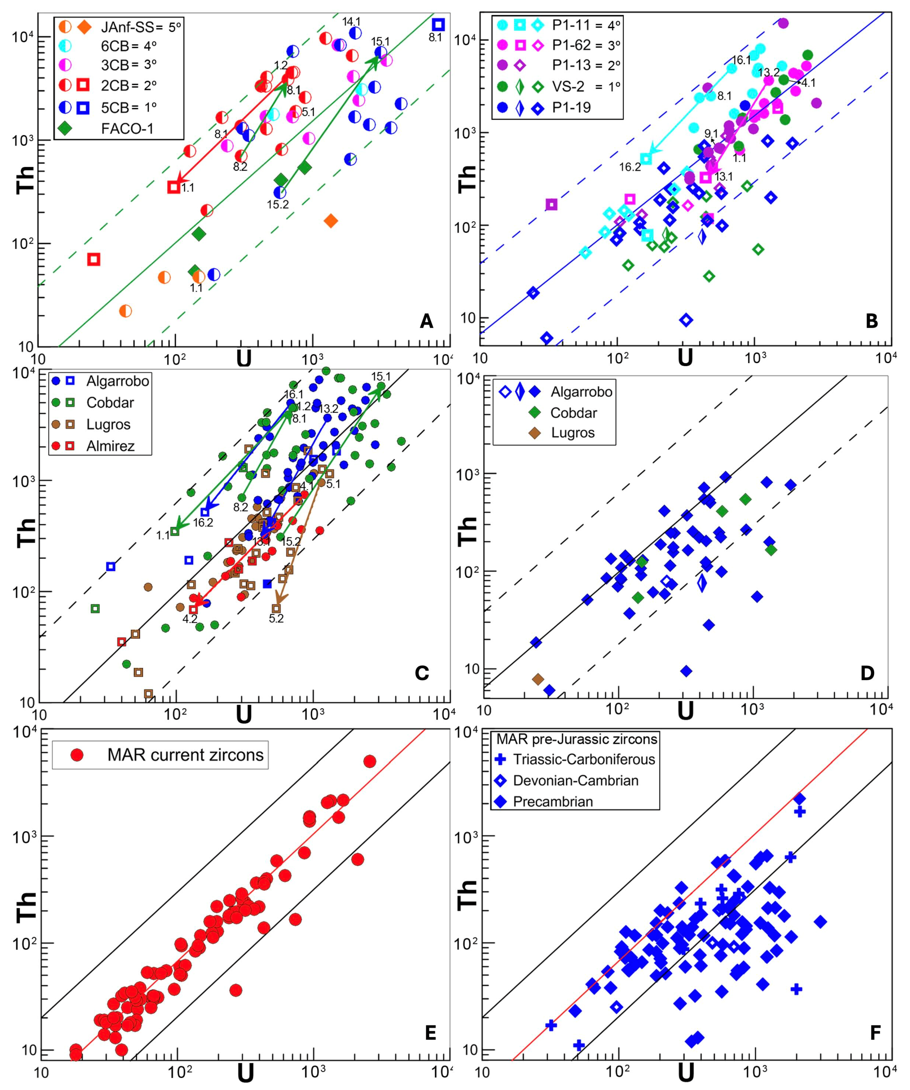 - Alongside the Jurassic zircons, pre-Jurassic xenocrystic zircon crystals, mainly of Precambrian age, were identified, primarily in samples from the Algarrobo outcrop. These xenocrysts are similar in age and chemical composition to those coexisting with modern volcanism dredged from the Mid-Atlantic Ridge (MAR) near fracture zones and from other ultra-slow ridges like the Southwest Indian Ridge (SWIR) at the Atlantic Bank. The similarity in age and chemical composition of the Precambrian xenocrystic zircon of the Betic ophiolites and those dredged from the MAR and SWIR suggests a similar tectonic setting for magmatism in both the Jurassic Betic Ocean and contemporary ultra-slow oceanic ridges.
