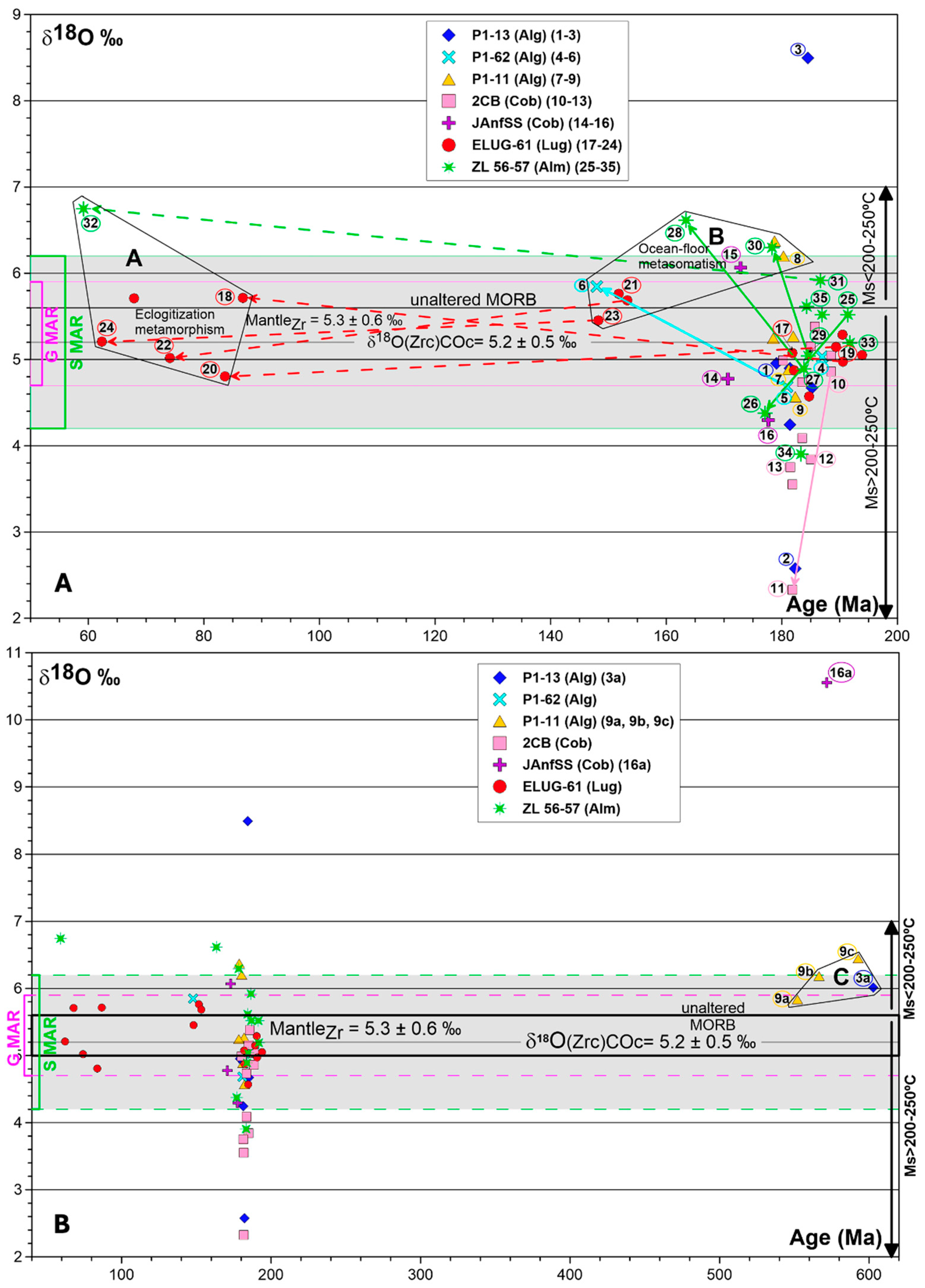 - Additionally, some zircon crystals from the Betic ophiolites preserve local variations in their δ18O values. These variations record two distinct metamorphic events: an earlier one dated to ~150 Ma, interpreted as oceanic floor metamorphism, and later Cenozoic ages, attributed to the orogenic metamorphism that affected the host rocks.