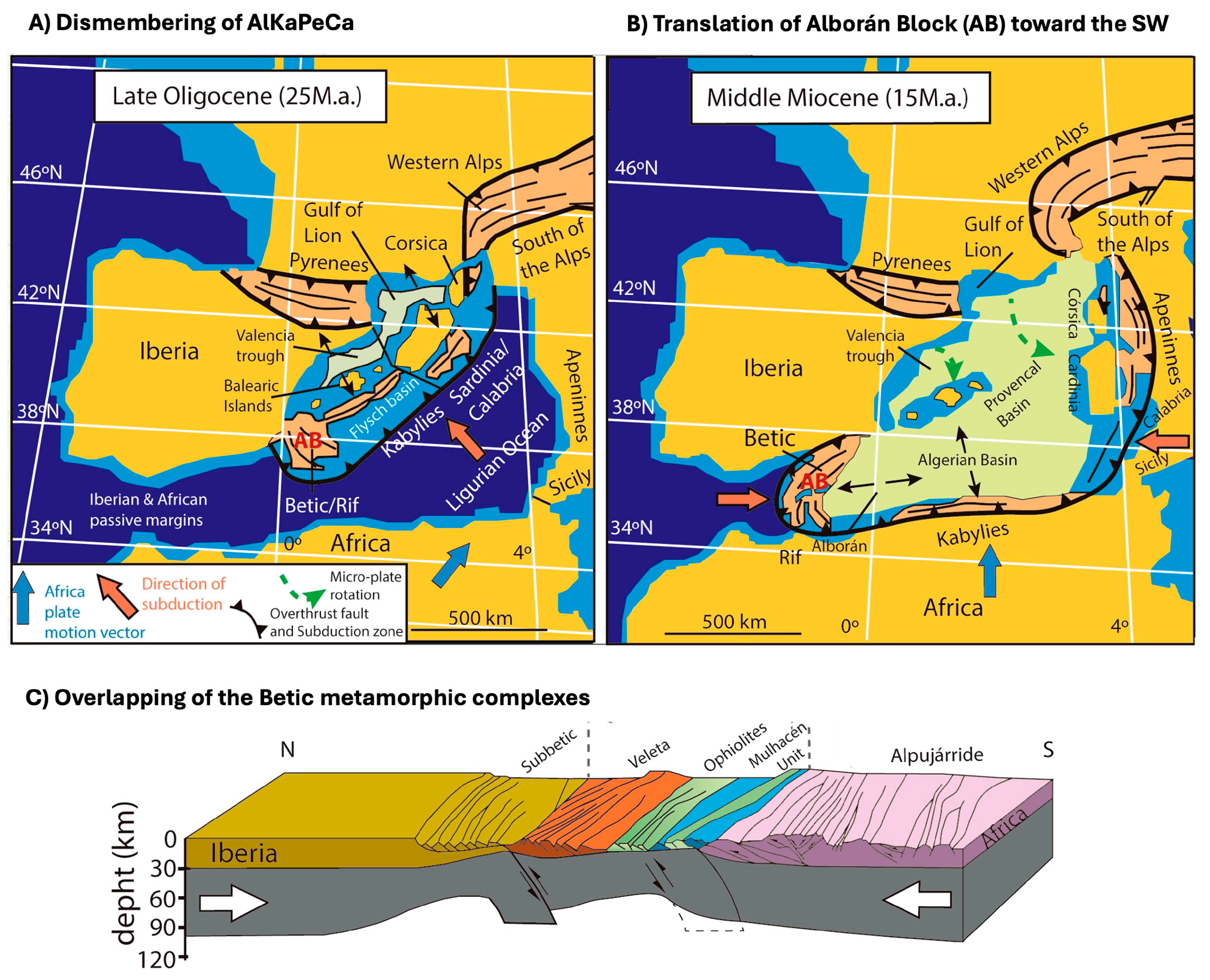 - Bouillin, J.P.; Durand-Delgá, M.; Olivier, P.H. Betic-Rifain and Tyrrenian Arcs: Distinctive features, genesis and development stages. In The Origin of Arcs; Wezel, F.C., Ed.; Elsevier: Amsterdam, The Netherlands, 1986; pp. 281–304. [Google Scholar]