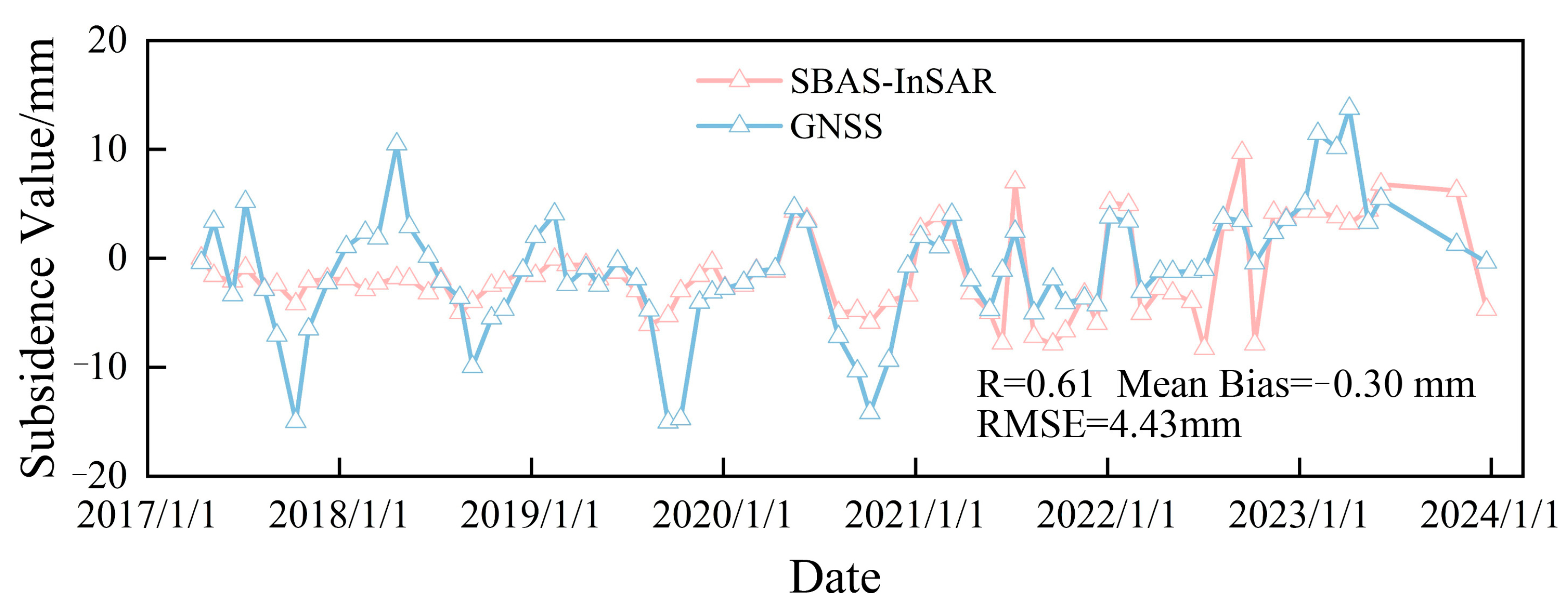 - Chen, Y.; Yu, S.W.; Tao, Q.X.; Liu, G.L.; Wang, L.Y.; Wang, F.Y. Accuracy verification and correction of D-InSAR and SBAS-InSAR in monitoring mining surface subsidence. Remote Sens. 2021, 13, 4365. [Google Scholar] [CrossRef]