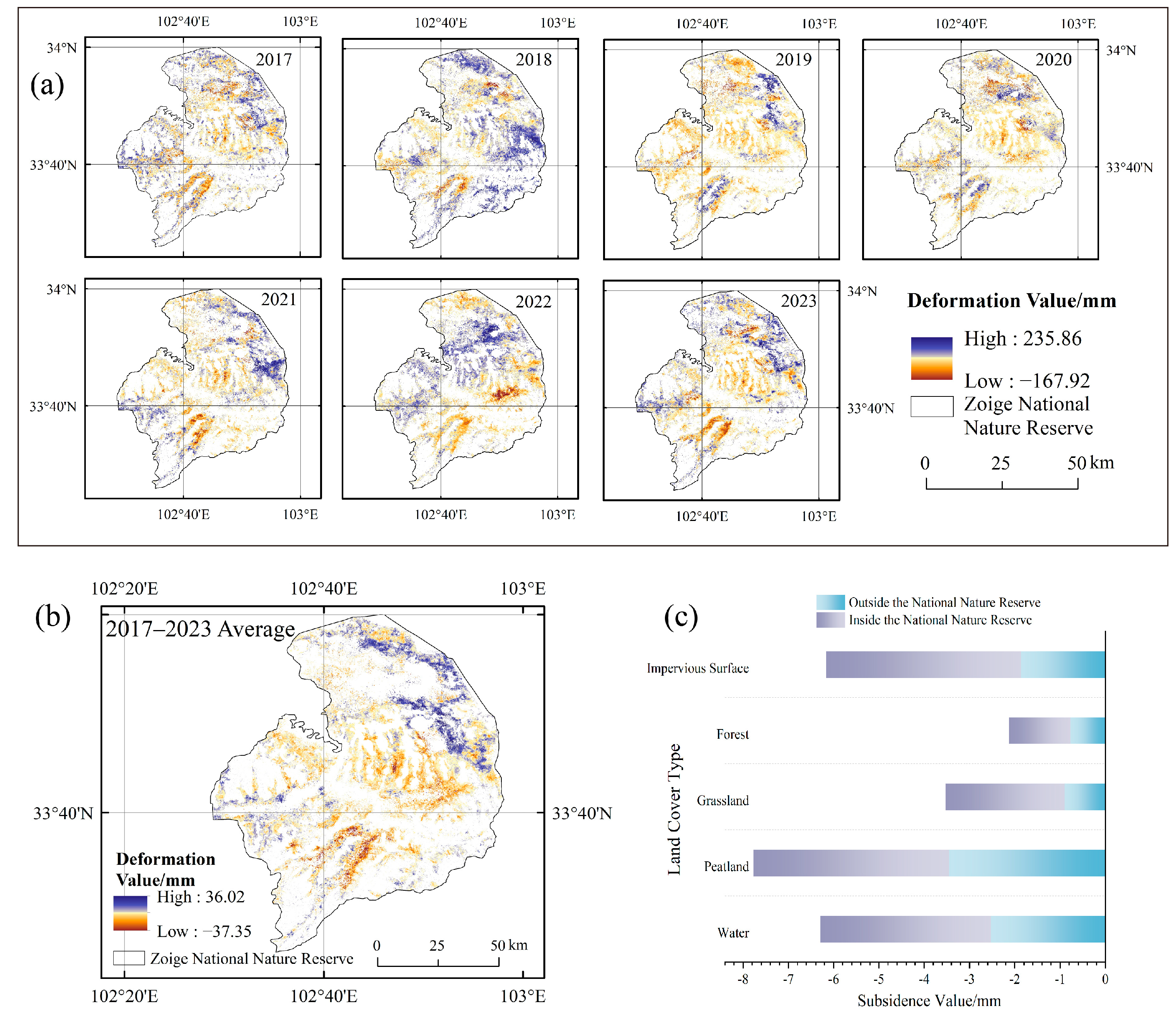 - Tian, E. Zoige Peatland Surface Deformation and Driving Factors Dataset (2017–2023); Zenodo: Geneve, Switzerland, 2025. [Google Scholar] [CrossRef]