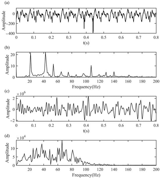 In the equation, t denotes the partial derivative with respect to time t , δ t represents the Dirac delta function, ω k is the center frequency of the k -th mode, u k denotes the k -th IMF component, and f t is the original input signal. To solve for the minimum of Equation (1), a Lagrange multiplier λ and a quadratic penalty factor α are introduced, transforming the original constrained variational problem into an unconstrained one.