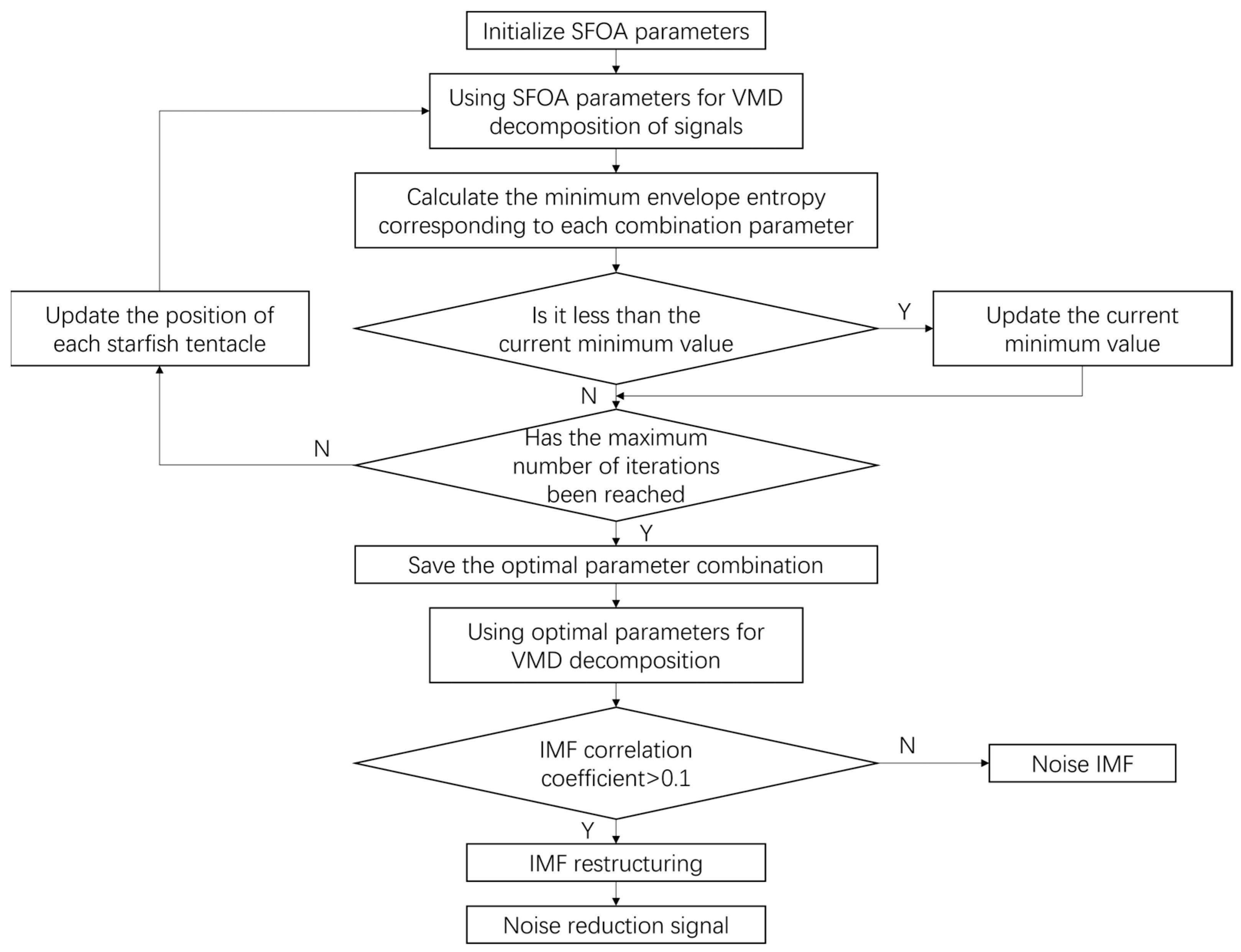 (1) Initialize the parameters of the Starfish Optimization Algorithm (SFOA). Using minimum envelope entropy as the objective function, employ SFOA to determine the optimal number of VMD modes k and the penalty factor α .