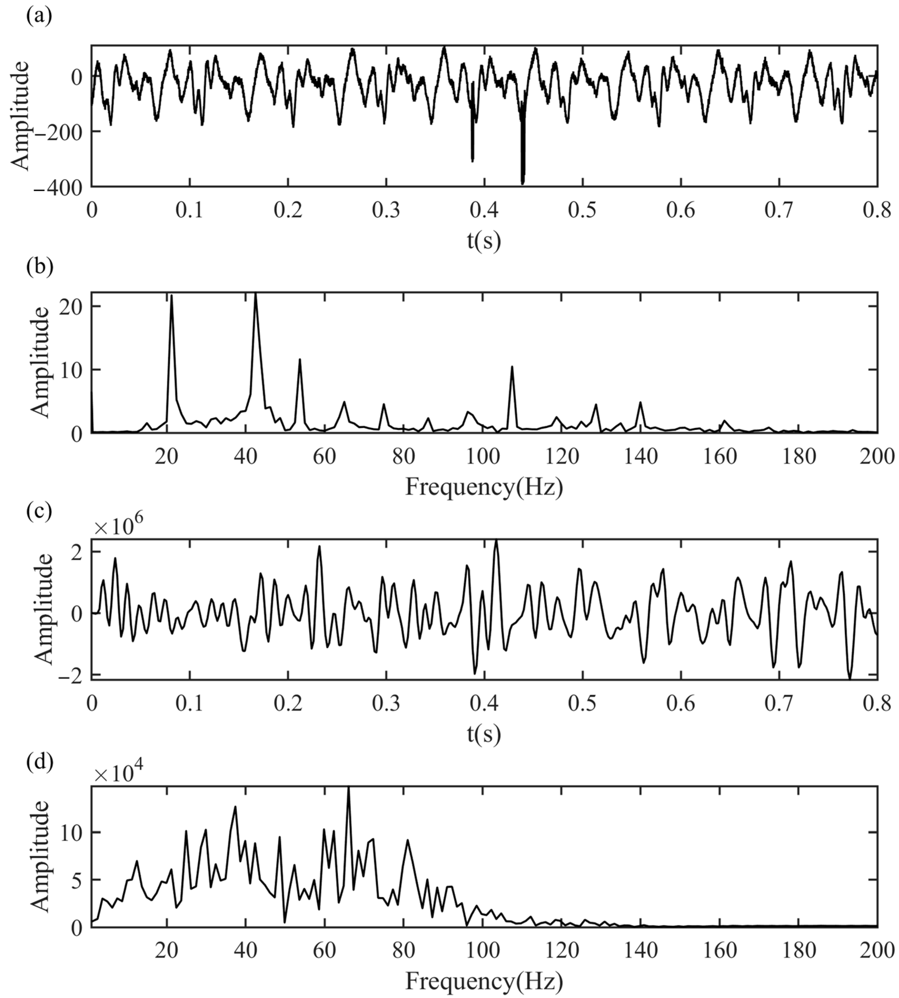 Figure 10. Comparison Between While-Drilling Acquired Signals and Conventional Seismic Signals. (a) Actual While-Drilling Acquired Signal. (b) Frequency Spectrum of While-Drilling Acquired Signal. (c) Conventional Seismic Signal. (d) Frequency Spectrum of Conventional Seismic Signal.