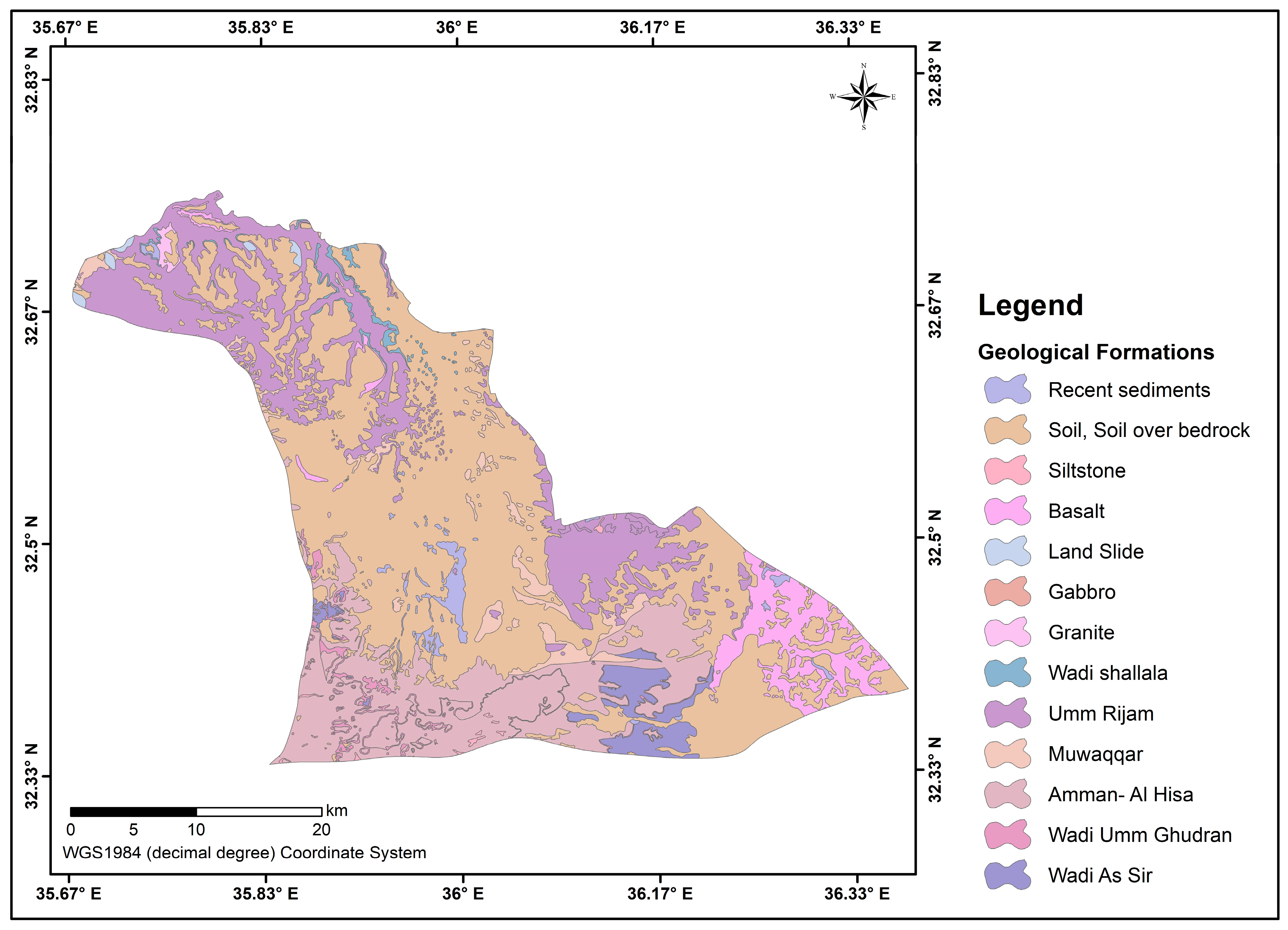 - Soboh, A. Geological Map of Ar Ramtha [Map]; Jordan Ministry of Energy and Mineral Resources—Natural Resources Authority (Geology Directorate): Amman, Jordan, 2013; National Mapping Project, Sheet No. (3255-II). [Google Scholar]