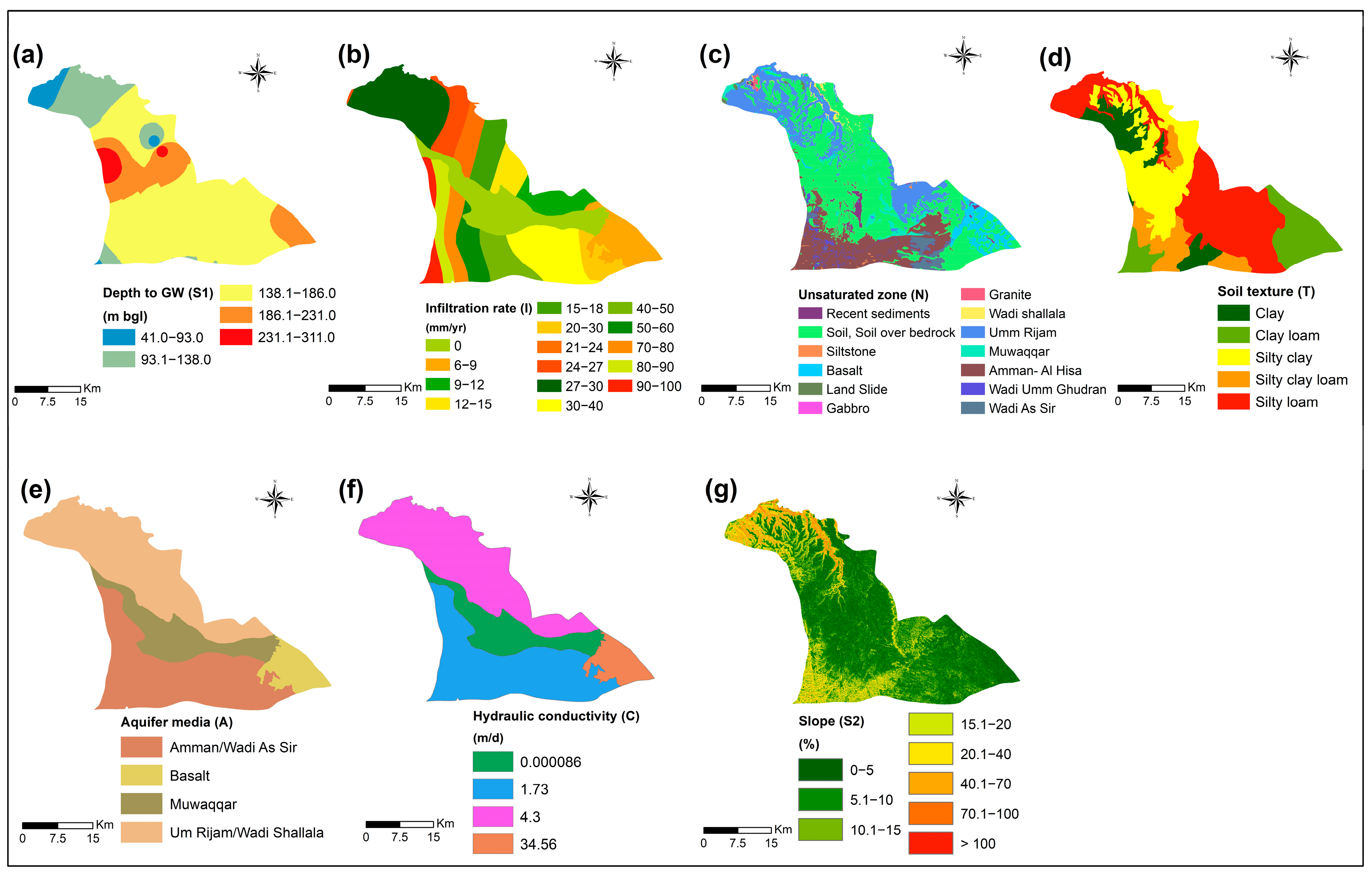 - Hamdan, I.; Al-Rawabdeh, A.; Al Hseinat, M. Groundwater Vulnerability Assessment for the Corridor Wellfield Using DRASTIC and Modified DRASTIC Models: A Case Study of Eastern Jordan. Open J. Geol. 2020, 10, 991–1008. [Google Scholar] [CrossRef]