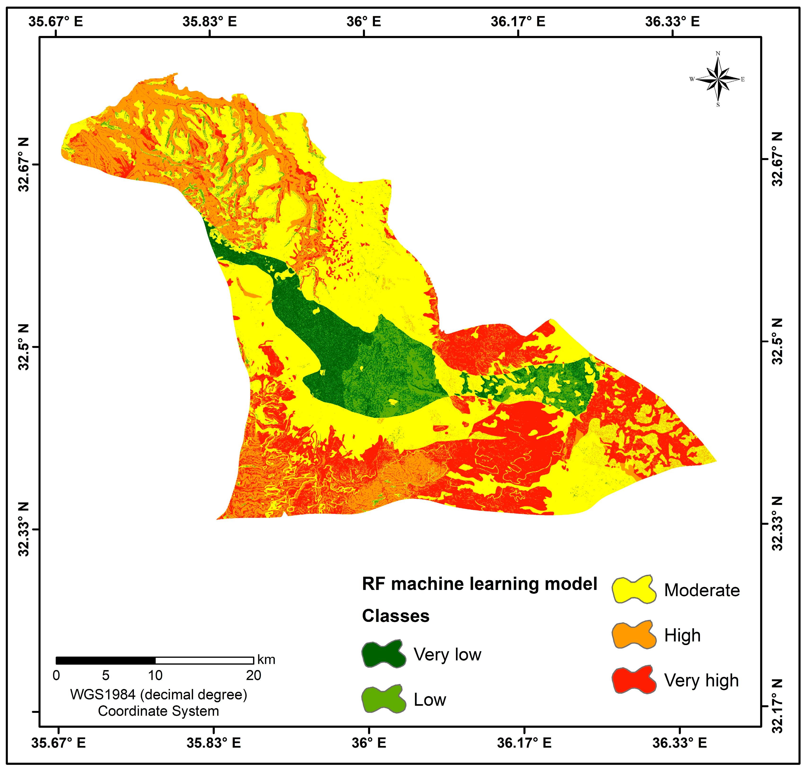 - Vulnerability Mapping: After training and validating the RF model, it predicts groundwater vulnerability for each pixel or grid cell in the study area based on the input parameter values for each cell. These results are displayed in a vulnerability map. The RF model produces a continuous vulnerability index, which is then categorized into discrete vulnerability levels (ranging from very low to very high) using appropriate normalization methods to create the final vulnerability map.