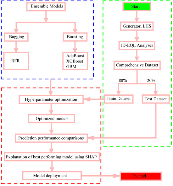 In this section, we will discuss the methodology adopted to develop and evaluate ML models for predicting PGA and PGD. Figure 1 shows a flowchart of the sequential steps undertaken in this study. As shown in the figure, the initial step begins with generating random soil data using Latin Hypercube Sampling (LHS), which is often preferred over simple Monte Carlo sampling due to its efficiency and ability to sample from entire parameter space. Five variables were selected as input features: reference peak ground acceleration (αgR), shear-wave velocity (Vs), soil thickness (H), plasticity index (PI), and unit weight of soil (γ), to develop the models. The selection of input features is based on their well-established relevance to seismic site response assessment. For instance, PI serves as an indirect indicator of soil nonlinearity. In equivalent-linear (EQL) site response evaluations, the stress–strain behavior of soils is commonly represented through modulus reduction and damping curves, which are governed by soil plasticity and other soil properties. These nonlinear characteristics were taken into account by varying PI values within the Darendeli [17] framework.