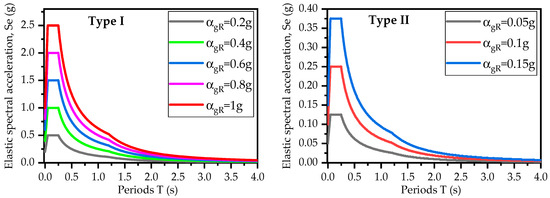 In the 1D-EQL technique, input motion records (in the form of acceleration time-histories) are applied at the base of the site profile to perform response analysis. Often, these input motion records are selected from ground motion databases that compile real seismic data from monitoring stations worldwide. In this study, records from the Pacific Earthquake Engineering Research Center (PEER) [22] ground motion database were utilized to conduct a series of 1D-EQL response analyses. The Eurocode Type I and Type II spectra (Figure 3) were used as target spectra to identify suitable records in the database [23]. These spectra were customized for reference peak ground acceleration values ranging from 0.05 to 1 g for type A ground conditions. Based on Eurocode 8 [23], type A ground is characterized by Vs greater than 800 m/s. The variation in effectively represents the variability in input motion intensity. Therefore, in this study, the terms “reference peak ground acceleration ()” and “input motion intensity” are used interchangeably. Some of the selected records closely matched the target spectra, while others were scaled to fit the target spectra. Table 2 presents a summary of the input motion records used in this study. The table shows details on the earthquake name and year, faulting mechanisms (e.g., strike-slip, normal, reverse), average shear-wave velocity for the top 30 m (Vs30) of the site, and scale factors applied to the records. The records were then applied at the base of site profiles to compute peak ground acceleration (PGA) and displacement (PGD) at surface level. The statistical summary of obtained PGA and PGD values is presented in Table 3.