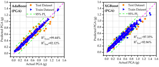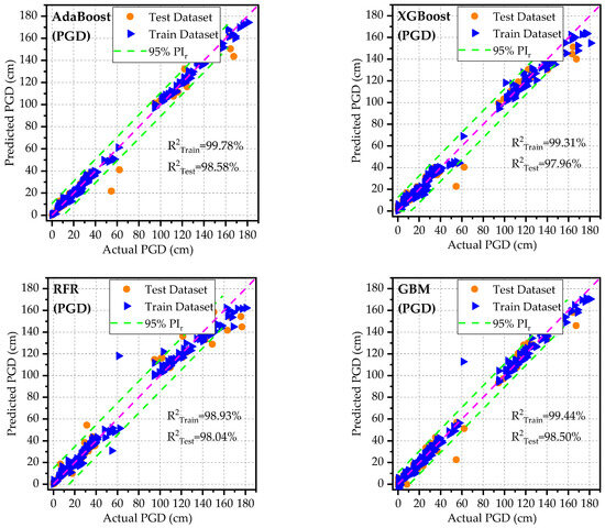 Actual versus predicted PGD based on developed models for test and training datasets.