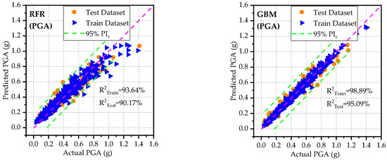 The performance of each ML model is assessed using several statistical metrics (see Table 4), including root mean squared error (RMSE), mean absolute error (MAE), mean absolute percentage error (MAPE), coefficient of determination (), Index of Agreement (AI), and Kling–Gupta efficiency (KGE) [48,49]. In addition, residual-based prediction intervals were constructed for both PGA and PGD to quantify the predictive uncertainty of each model. The was derived using the standard deviation of residuals obtained from the testing datasets. For each prediction, the 95% prediction interval was calculated around the predicted mean value. These intervals provide an estimate of the range within which the true PGA or PGD values are expected to fall with 95% confidence.