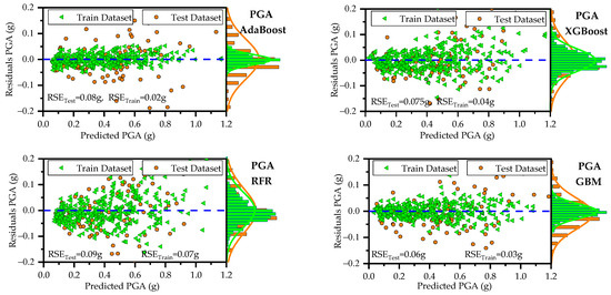 - The PGA model achieved excellent performance, with an of 95.95%, a KGE of 93.93%, and an IA of 98.92%, all with minimal errors (RMSE = 0.059 g, MAE = 0.041 g, and MAPE = 12.07%). Similarly, the PGD model achieved an of 98.81%, a KGE of 97.17%, and an IA of 99.69%, with errors of RMSE = 4.71 cm and MAE = 2.01 cm on the test dataset. Notably, for both PGA and PGD models, the residuals had the smallest ranges centered around zero for the test dataset.
