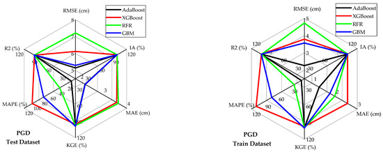 Comparative performance analysis of models in predicting PGD for test and training datasets.
