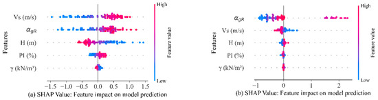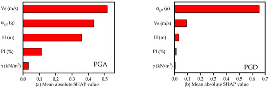 The overall importance of each feature is determined by averaging its absolute Shapley values across the entire dataset. These averages are then ranked and displayed in descending order of importance, as shown in Figure 11. A feature with the highest absolute SHAP value is considered the most impactful factor influencing the prediction of GBM. For PGA (Figure 11a), soil shear-wave velocity is identified as the most influential feature, while for PGD (Figure 11b), input motion intensity emerges as the most influential feature. Soil layer thickness () ranks third in importance for both PGA and PGD, indicating its role in modulating wave amplification and energy dissipation through soil strata. The plasticity index () and unit weight () show lower overall importance but still contribute meaningfully to the models’ predictions.