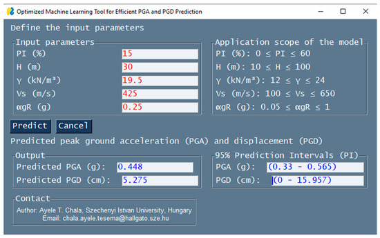 For the practical implementation of the model, a user-friendly software tool was developed based on the best-performing model (in this case, the Gradient Boosting Machine, GBM model). The graphical user interface (GUI) for the software is shown in Figure 12 and is accessible at https://github.com/Ayele-Tesema/PGA_PGD_Predictor (accessed on 15 October 2025). The model provides rapid predictions of PGA and PGD based on user-input values for the features , , , , and . For instance, entering values of 15% for , 30 m for , 19.5 kN/m3 for , 425 m/s for , and 0.25 g for yields predicted PGA and PGD values of 0.448 g and 5.275 cm, respectively. The 95% prediction interval for PGA is 0.300–0.565 g, while for PGD it ranges from 0 to 15.59 cm. While the predicted values represent the most probable estimates, the prediction intervals quantify the uncertainty associated with model predictions at a 95% confidence level. This information is particularly important in geotechnical engineering, where variability in soil properties and ground motion parameters can significantly influence engineering decisions. Predictions are generated when the “Predict” button is clicked. For the same input feature values, a 1D-EQL analysis using STRATA software produced PGA and PGD values of 0.47 g and 5.25 cm, respectively, demonstrating the effectiveness and reliability of the developed tool in providing comparable results.