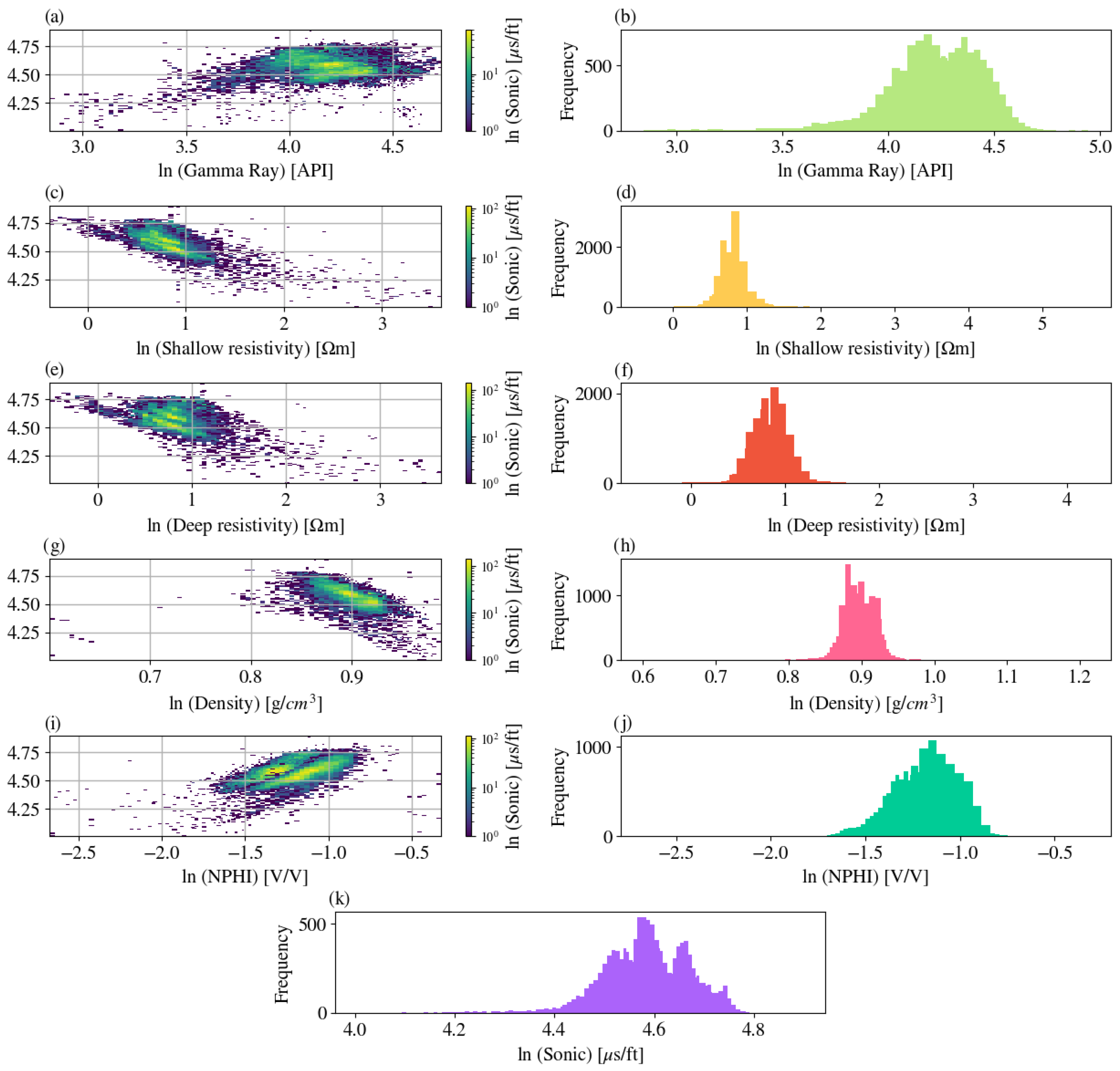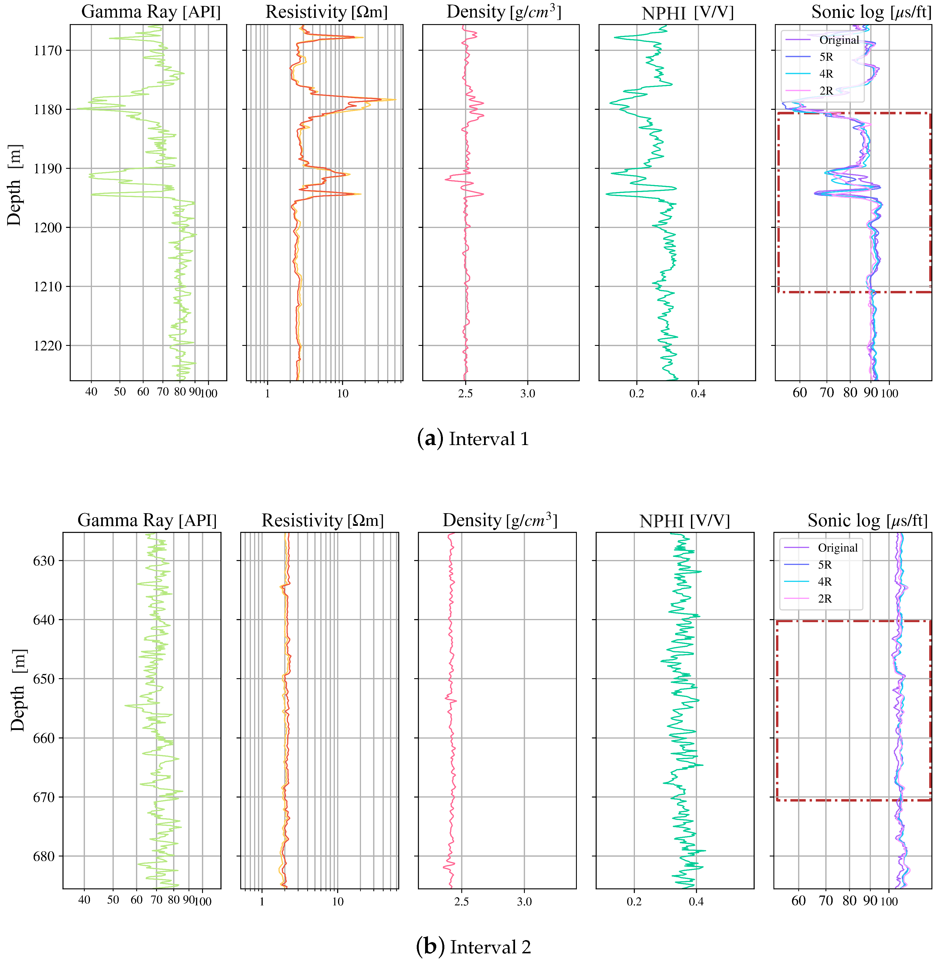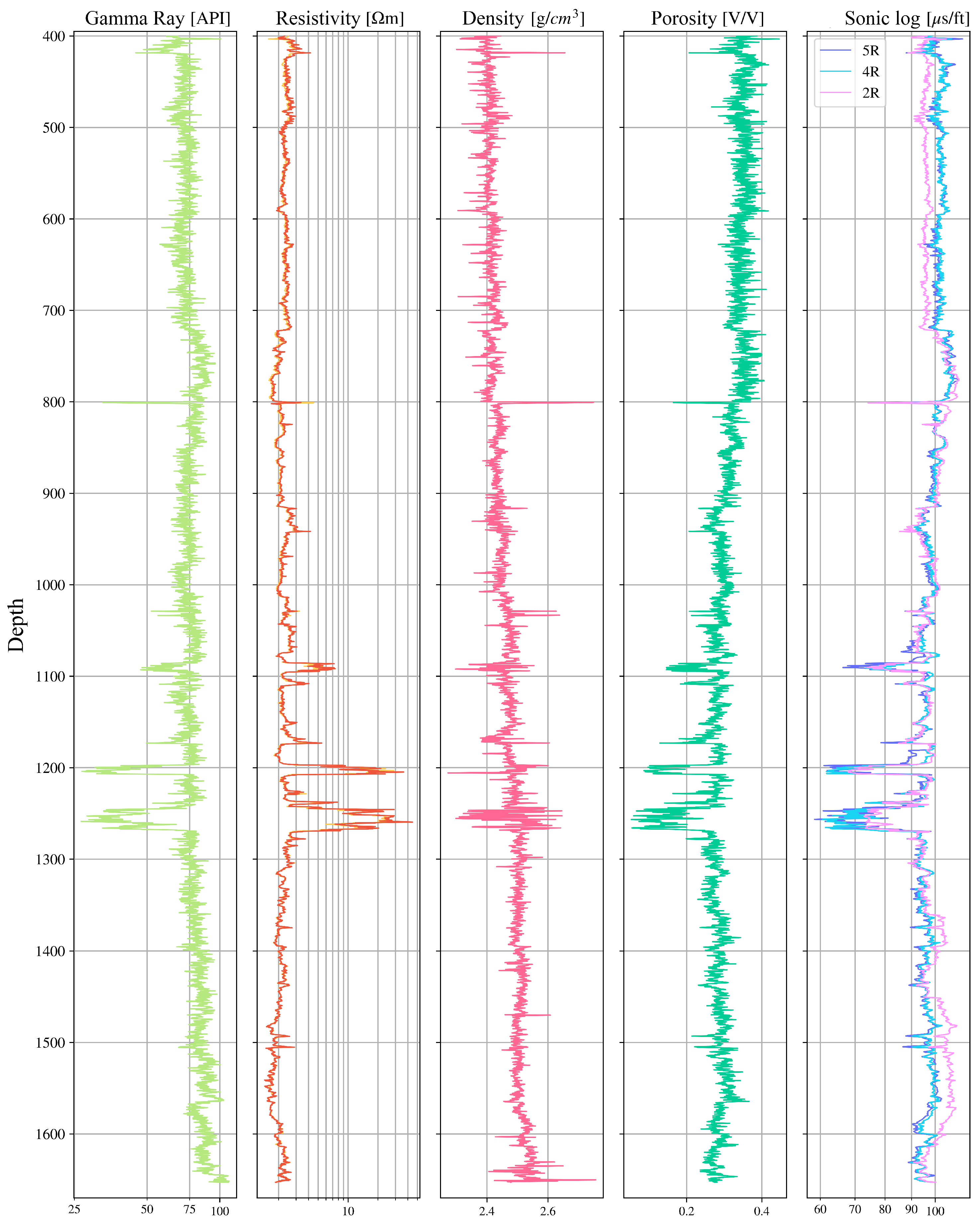 - Outliers and flags: Obvious tool-failure values were masked, and suspect intervals (e.g., washouts) were visually inspected across all logs. Values were removed only when the anomaly was inconsistent with the multi-log context.