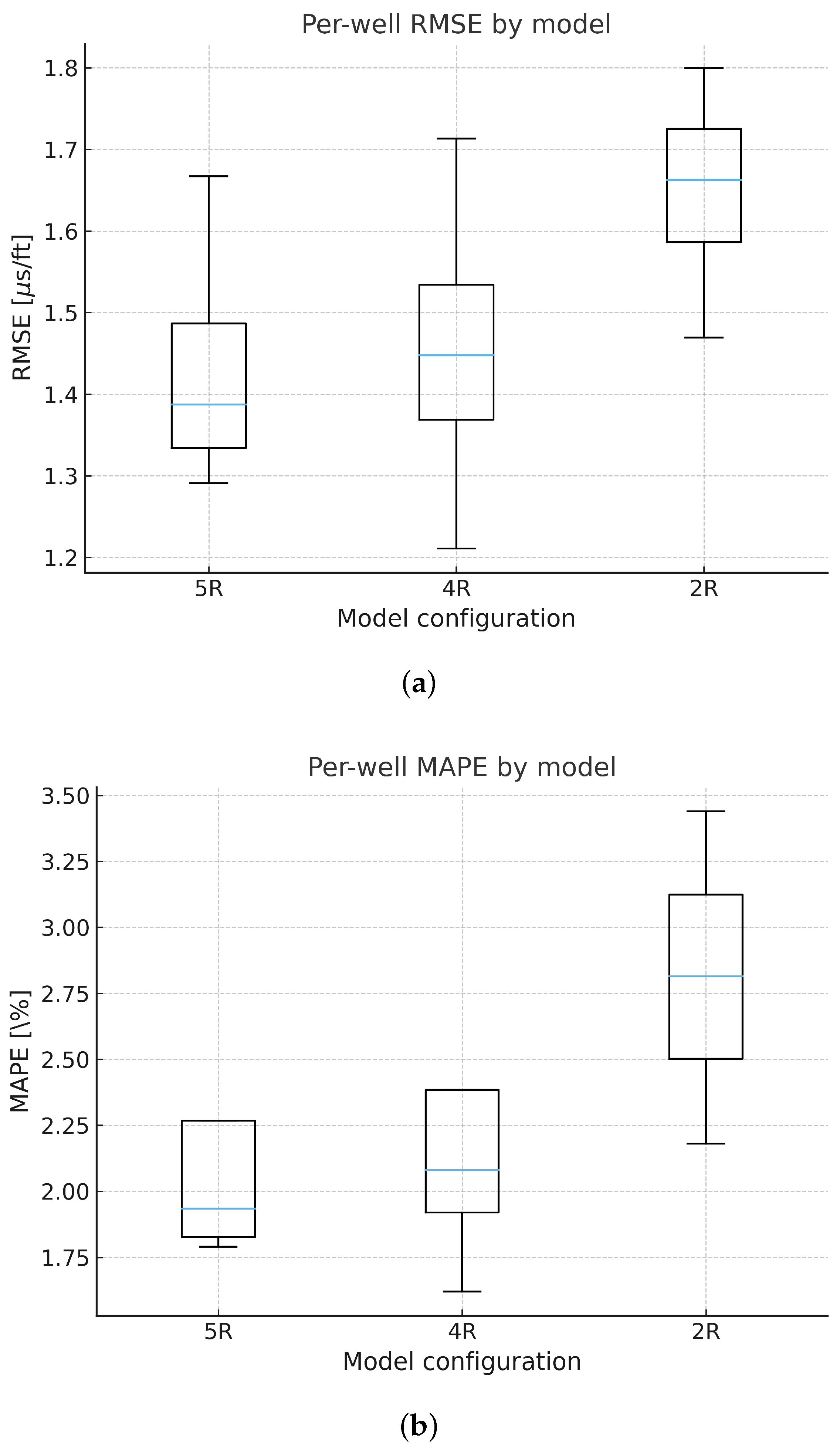 - Metrics: Root mean square error (RMSE, in s/ft), mean absolute percentage error (MAPE, in%), mean absolute error (MAE, in s/ft), and coefficient of determination (). Metrics are reported per well and as aggregated mean ± standard deviation.