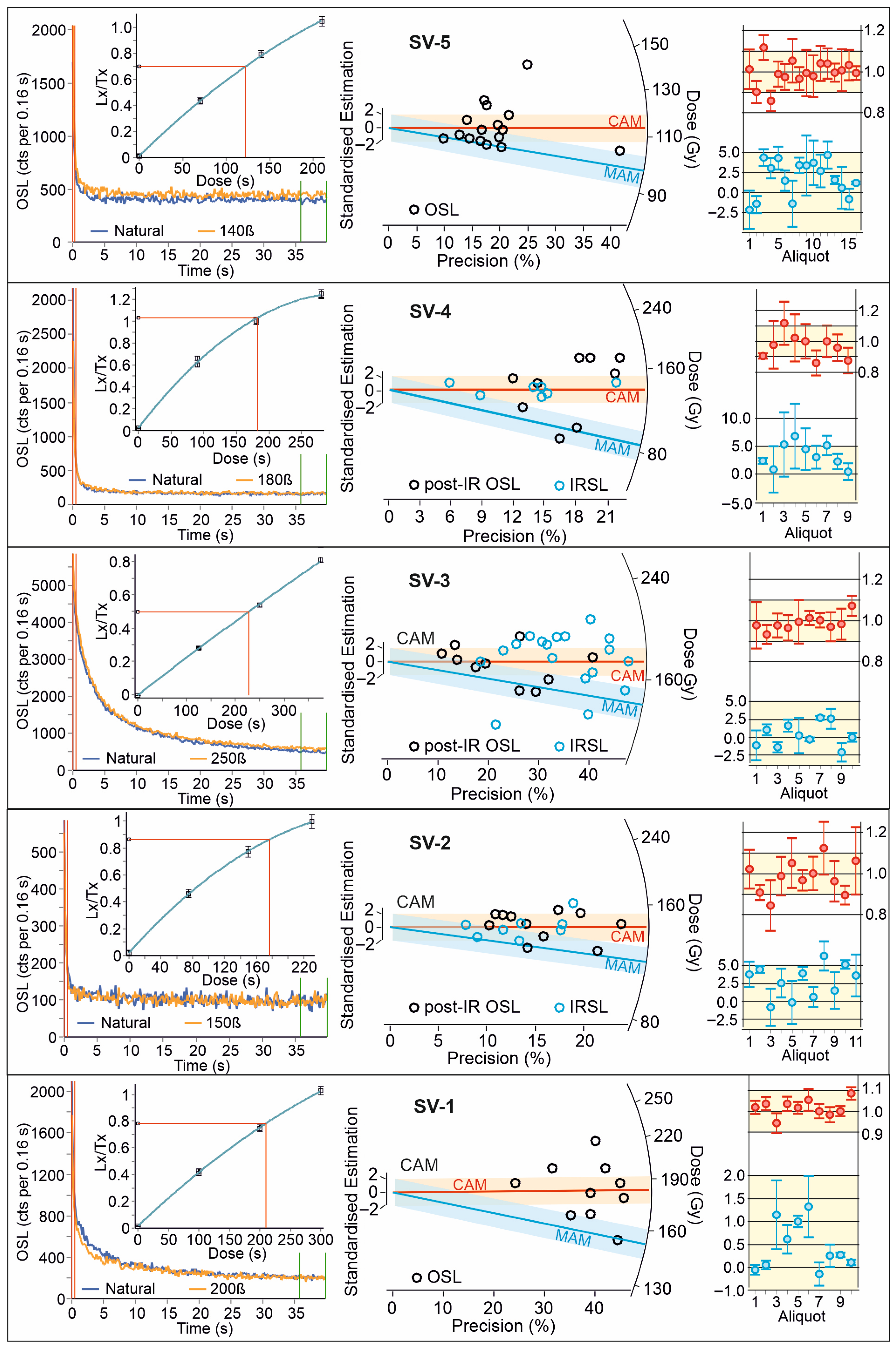 - Murray, A.; Arnold, L.; Buykaert, J.-P.; Guérin, G.; Qin, J.; Singhvi, A.; Smedley, R.; Thomsen, K. Optically stimulated luminescence dating using quartz. Nat. Rev. Method Prim. 2021, 1, 1–31. [Google Scholar] [CrossRef]
