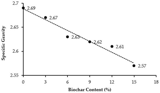 The specific gravity of the test clay was 2.69, and it decreased systematically with increasing biochar content (Table 1). The reduction followed a nearly linear trend, reaching 2.57 at 15% biochar (Figure 1). The decline reflects the low density and high porosity of the biochar, which, when blended with the denser clay minerals, results in a lighter soil-biochar matrix.