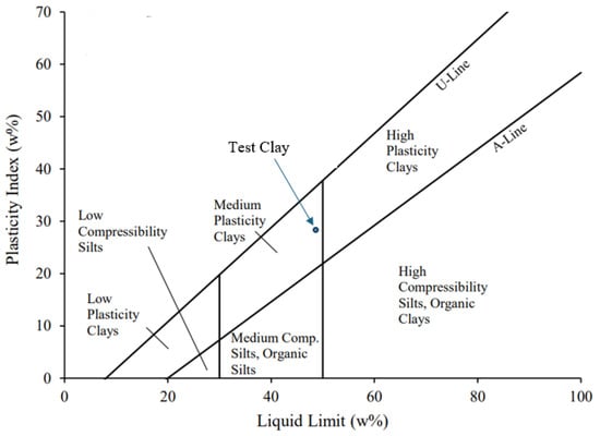 The presence of clay minerals in the soil contributes to its tendency to swell and shrink depending on moisture content. Plasticity refers to a physical characteristic of the interaction between clay and water. It can be quantified through various methods, including Atterberg limits, Pfefferkorn test, penetrometer, capillary rheometer, Brabender rheometer, and tension-deformation analysis []. The plastic behavior of soil is indicative of the presence and nature of clay minerals []. These plasticity characteristics significantly influence the geotechnical behavior of soils. According to Mitchell and Soga [], “the greater the plasticity, the greater is the shrinkage on drying (the lower the shrinkage limit).” Furthermore, they note that “the swelling and shrinking properties of the clay minerals follow the same pattern as their plasticity properties; that is, the more plastic the mineral, the more potential for swell and shrinkage.” Based on the Unified Soil Classification System (USCS, []), the soil was identified as a medium plasticity clay, as indicated in Figure 2 as “Test Clay.” To confirm the classification, the Liquid Limit test was repeated, as the initial value was near the threshold between medium and high plasticity. Since the average Liquid Limit remained close to 50%, the clay was classified as having medium plasticity.
