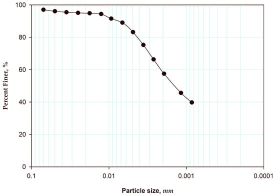 Since the test clay proved to be fine-sized, a Hydrometer Analysis was run to characterize its particle size distribution. The particle size distribution that was obtained for the test clay, following ASTM D7928 [], is shown in Figure 3.