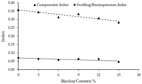 Bian, et al. [] observed that soil amended with biochar and high moisture content exhibited favorable geotechnical properties. Specifically, increasing the biochar content was associated with decreases in both the compression index and void ratio, indicating improved soil performance. Biochar also influences various physical and chemical aspects of soil behavior [,,,].