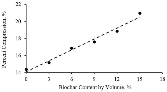 A clear trend of increasing compressibility with higher biochar content was also observed. The percent compression was selected as a measure of the degree of compressibility in all specimens. It was calculated as the change in thickness of the sample divided by the initial thickness and expressed as a percentage quantity. For the Test Clay, it was 14.36%, whereas it increased linearly to 21.0% for Clay + 15% Biochar by volume. Figure 6 presents the results obtained for all specimens. This behavior is attributed to the porous and high-surface-area structure of biochar, which introduces additional voids within the soil matrix by trapping air and water, thereby enhancing the mix’s overall compressibility.