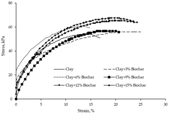 The internal friction angle () increased from 1.6° for untreated clay to 5.9° at 15% biochar, and the effective cohesion (c′) rose from 4.31 kPa to 22.50 kPa. This progressive enhancement indicates improved particle interlocking and bonding within the amended soil structure. The high specific surface area of biochar likely contributes to increased mechanical interparticle resistance and suction effects during drainage.