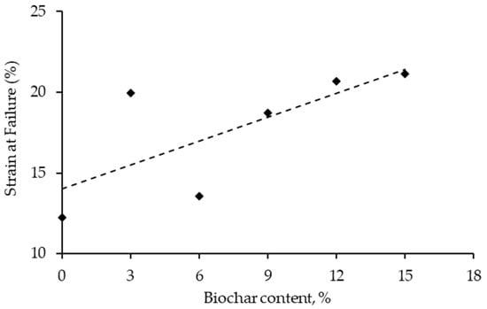 The UCS increased from 53.78 kPa for untreated clay to 65.50 kPa at 15% biochar, reflecting a clear improvement in structural integrity (Figure 12). Moreover, the strain at failure increased from 12.26% to 21.12%, indicating greater ductility in biochar-amended specimens (Figure 13). These outcomes suggest that biochar enhances both the strength and deformability of the soil, likely due to improved particle bridging, increased interfacial bonding, and the ability of the biochar pores to accommodate deformation without abrupt failure.