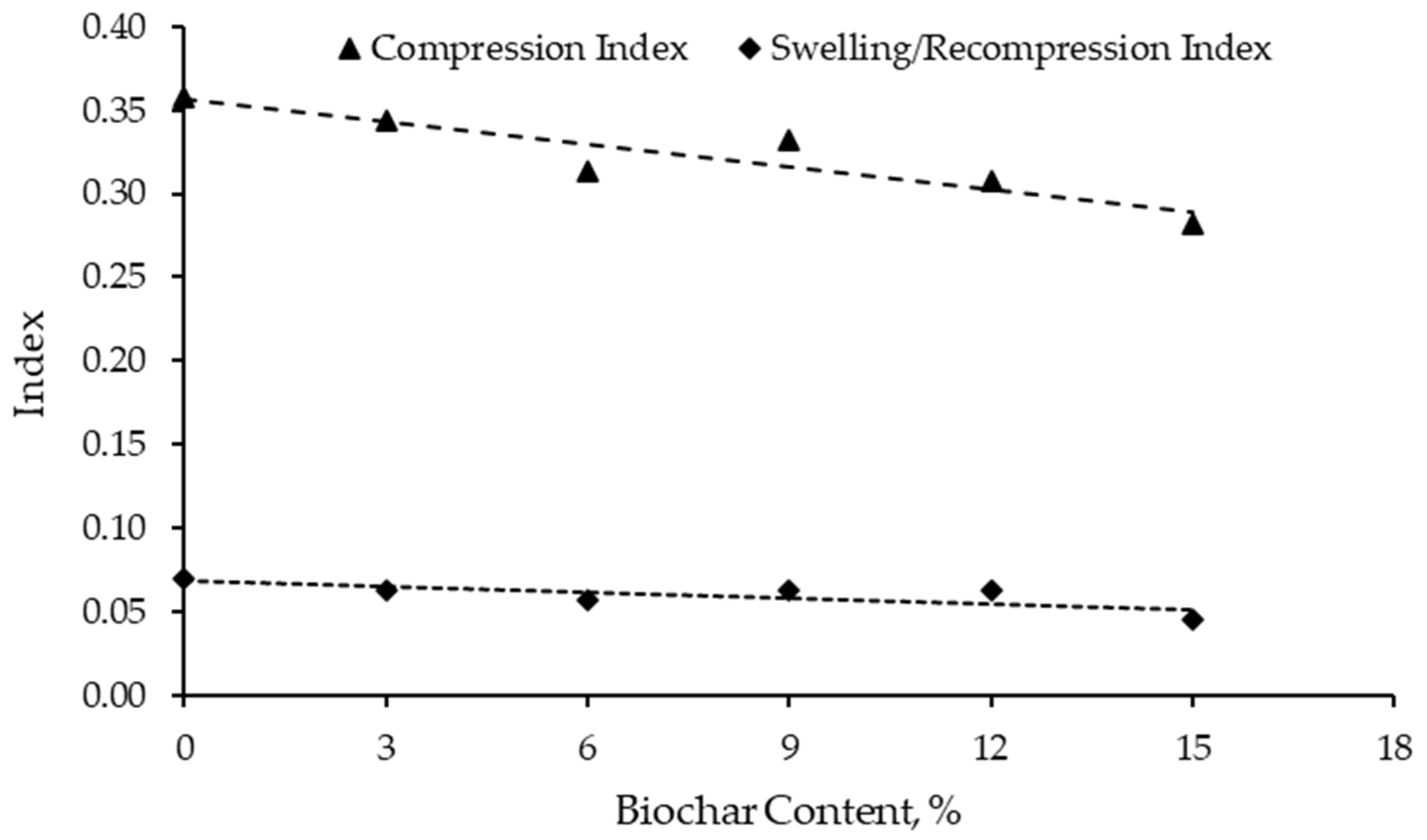 - Compressibility: Consolidation tests demonstrated increased compressibility with higher biochar content. This is likely due to the incorporation of porous biochar particles, which introduce additional voids and facilitate water retention within the soil matrix.