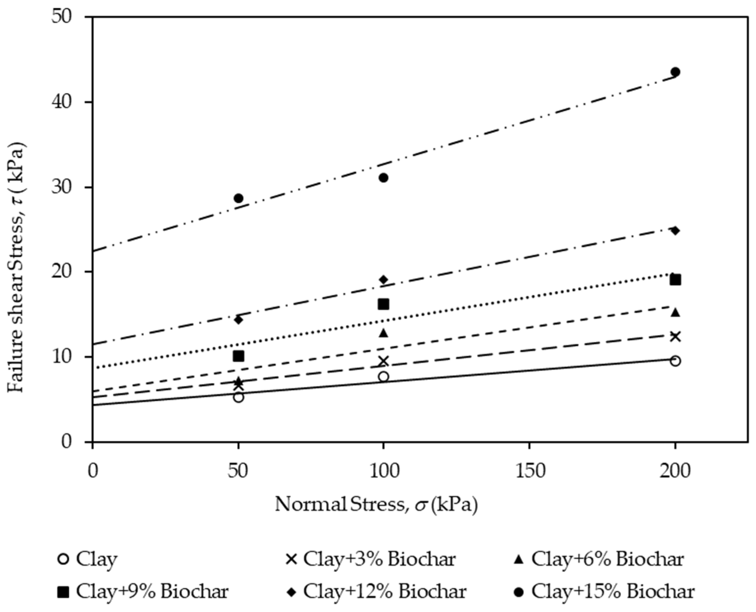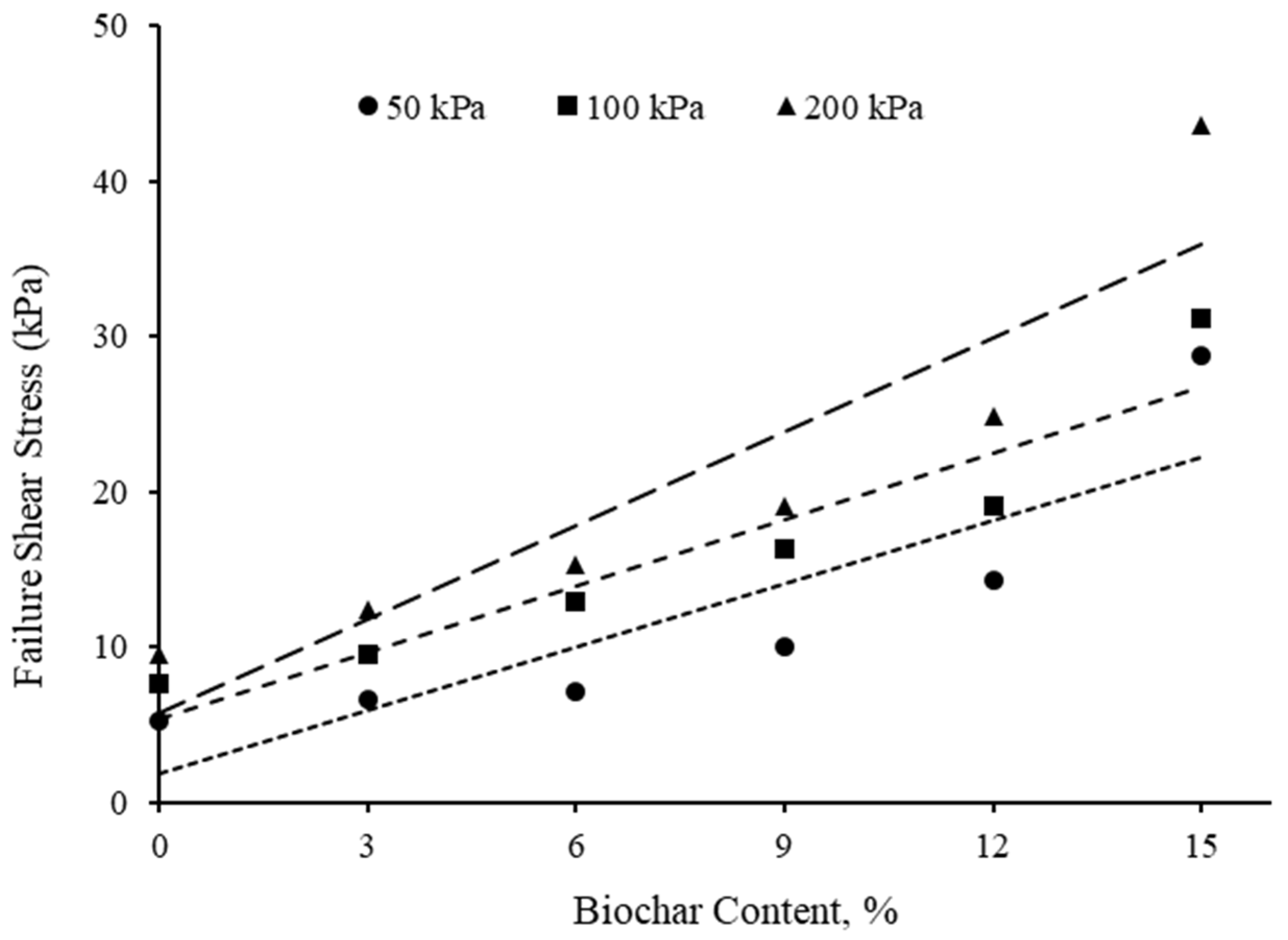 - Shear Strength Parameters: Direct shear testing revealed overall improvements in shear strength with biochar amendment. Both cohesion and internal friction angle increased with biochar content, suggesting that biochar enhances interparticle bonding and resistance to shear deformation under drained conditions.