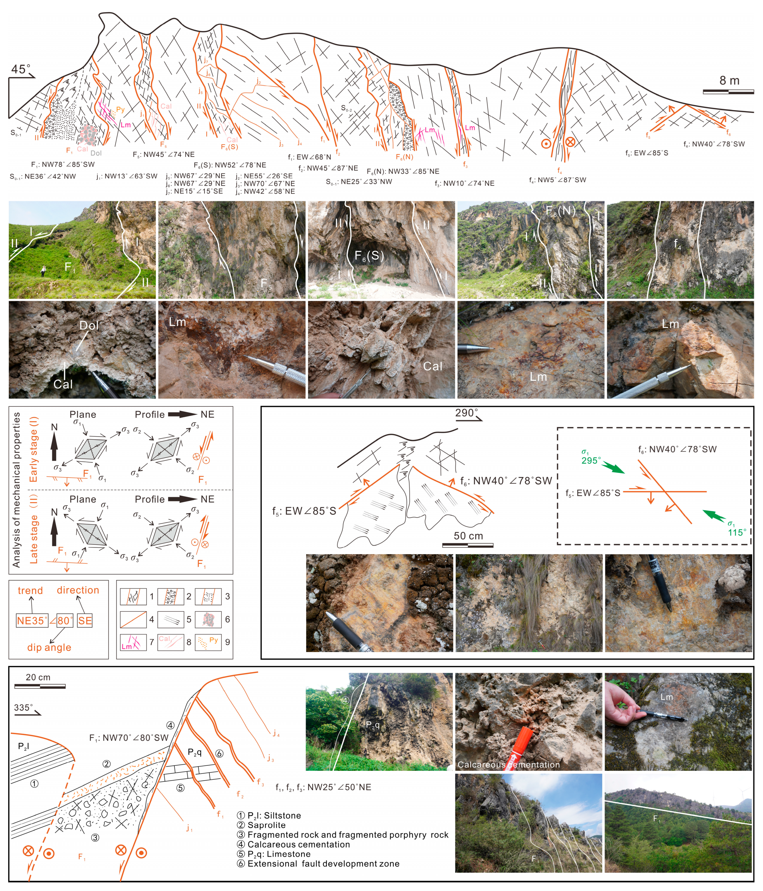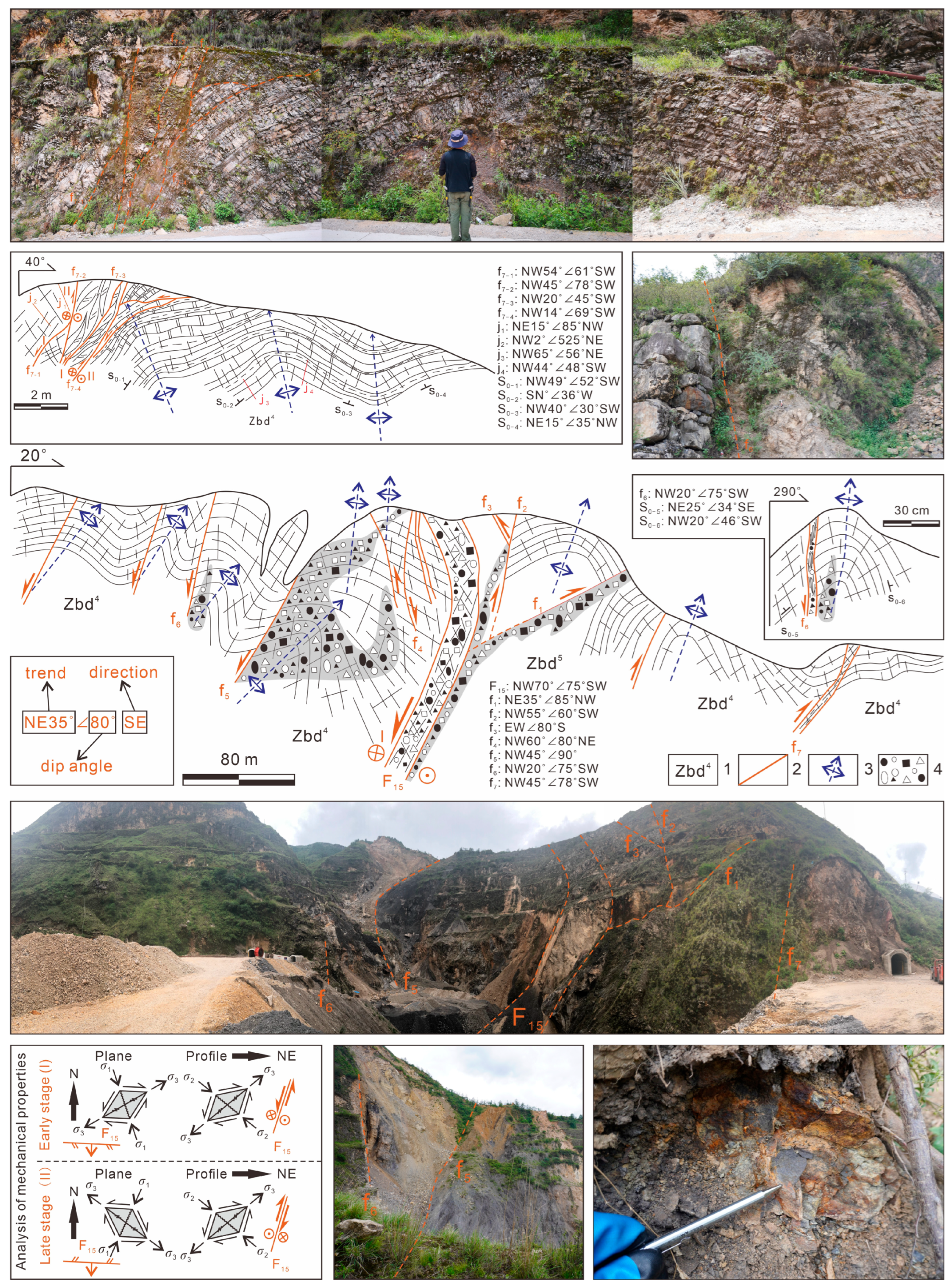 - Wu, J.B.; Han, R.S.; Feng, Z.X.; Wu, P.; Gong, H.S.; Ding, T.Z.; Zhao, X.Y.; Li, L.J.; Yang, B.; Yuan, H. F15 master-control fault and its ore-controlling effect of the Daliangzi lead-zinc deposit of southwestern Sichuan. Geol. Bull. China 2022, 41, 1869–1886. [Google Scholar]