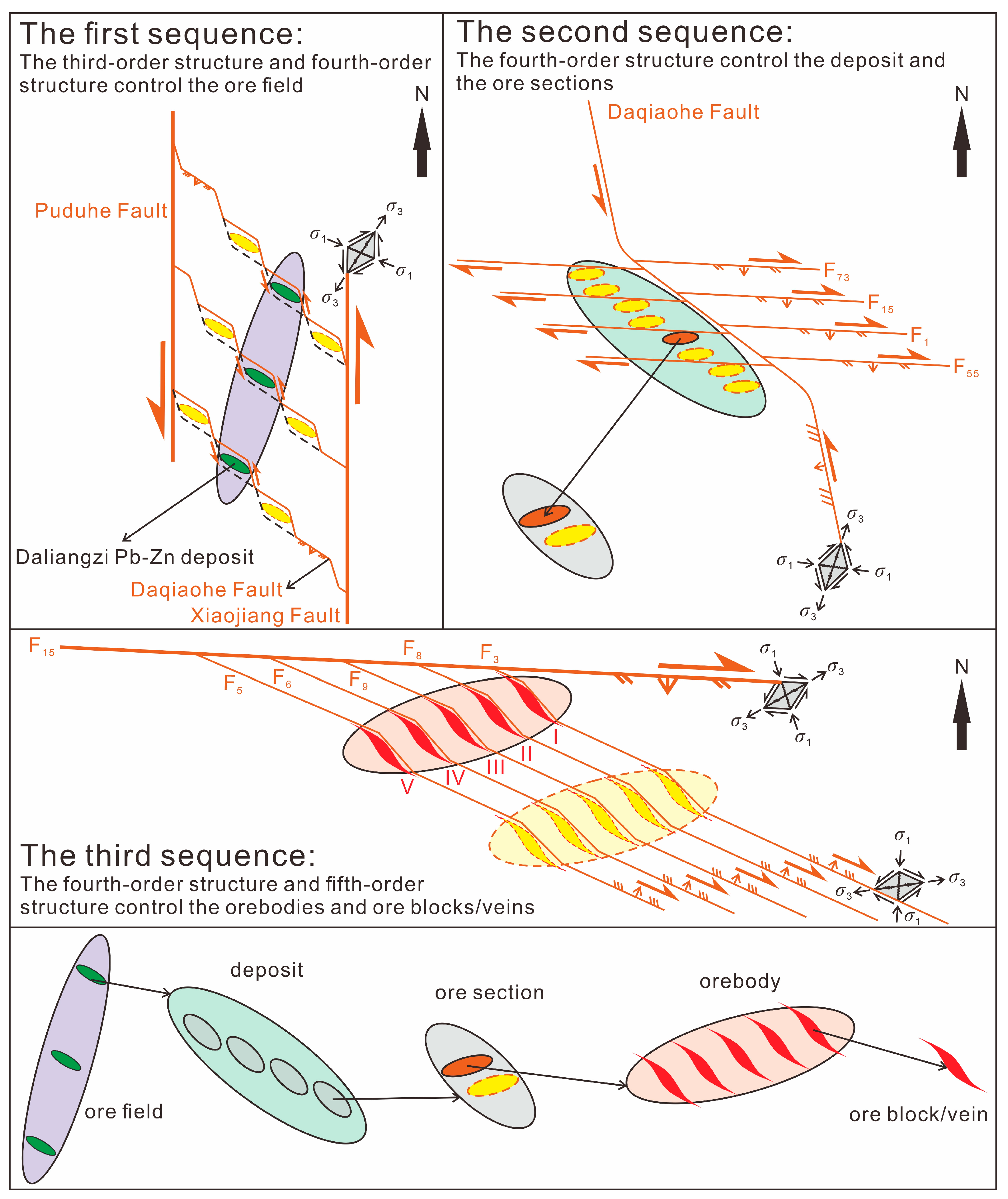 | ore field | / | / | ore field | / | / | (1) long axis of ore field = series plane of deposit (2) long axis of deposit = series plane of ore section (3) long axis of ore section = series plane of orebody (4) long axis of orebody = series plane of ore block/vein |