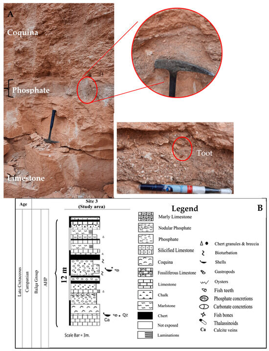 (A) Field photographs showing A dark, hard, massive sparitic limestone with a thickness of about 133 cm appears at the bottom, which contains calcite veins. Above this is a 15 cm layer of poorly sorted phosphate (sand size) containing extra- and intra-clasts of oyster shell fragments, calcite, quartz, chert, shells, and shark teeth, as illustrated in the magnified figures. This bed has an incrustation at the top. Overlying this is a massive bed of coquina, composed of fragmented oyster shells and measuring 110 cm in thickness (Hummer 30 cm). (B) Columnar sections of the outcrops. Legend: see Figure 1B.